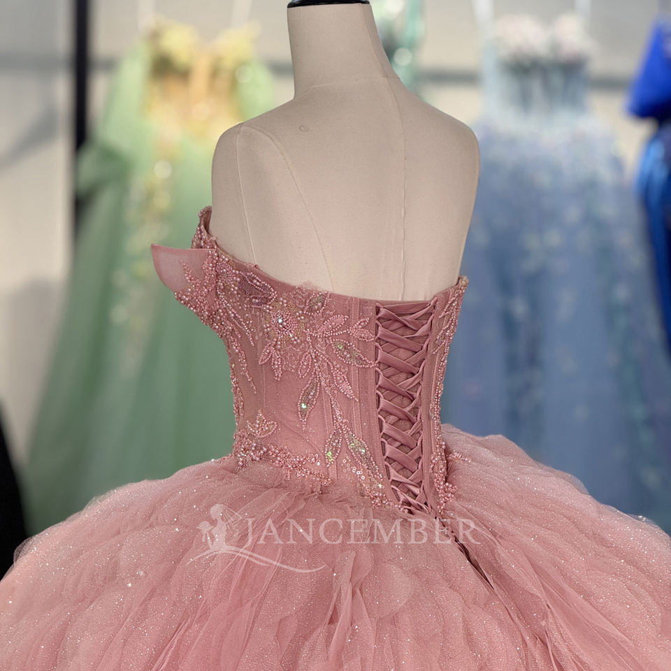6845 Robes de bal élégantes vintage rose avec dentelle, perles, appliques et cristaux, taille naturelle, traîne chapelle, pour Quinceañera et soirées