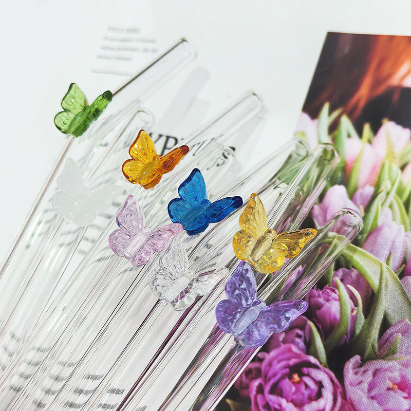 Pour Amazon High Borosilicate Glass Straw 8mm Butterfly Design Matériau en silicone écologique et résistant à la chaleur