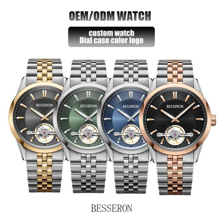 Montre automatique mécanique squelette 40 mm en acier inoxydable 316L, étanche 5 ATM, avec cadran en verre, chronographe, personnalisable avec votre logo pour les entreprises