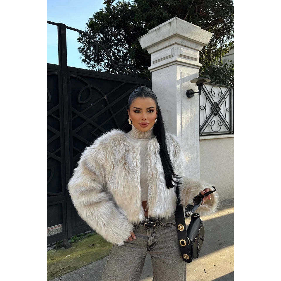 Manteau court en fourrure naturelle pour femme, couleur écru, imprimé vison et renard, avec fermeture à boutonnière simple et ceinture, en laine tissée et cachemire