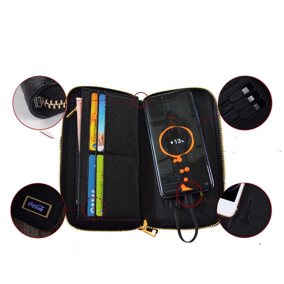 For Customized Open Long Leather Power Bank Wallet with RFID Wireless Charger Portable Credit Card Holder