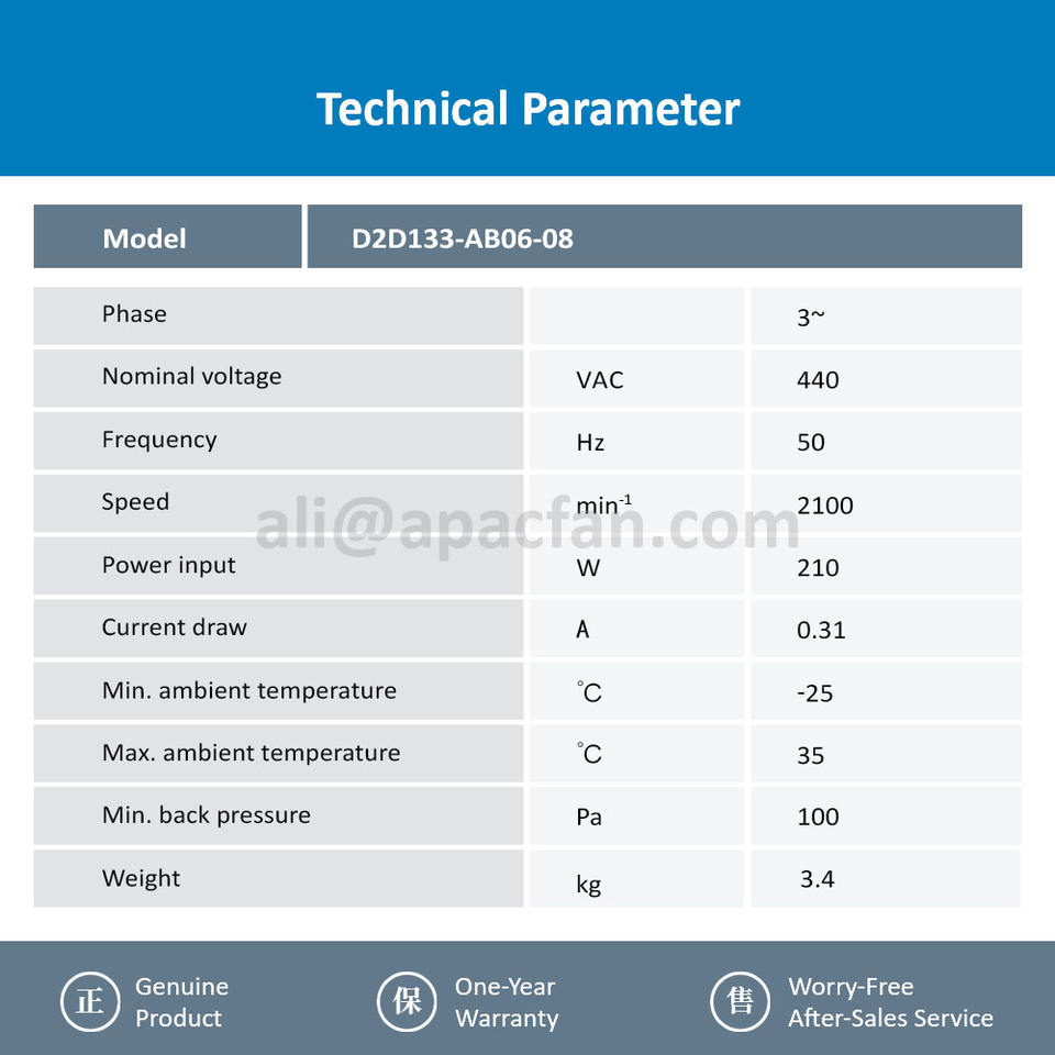 Moteur centrifuge AC à double entrée avec roulement à billes, 440 VCA, 210 W, 0,31 A, 2100 tr/min, pour armoire autoportante OEM 133 mm, référence D2D133-AB06-08
