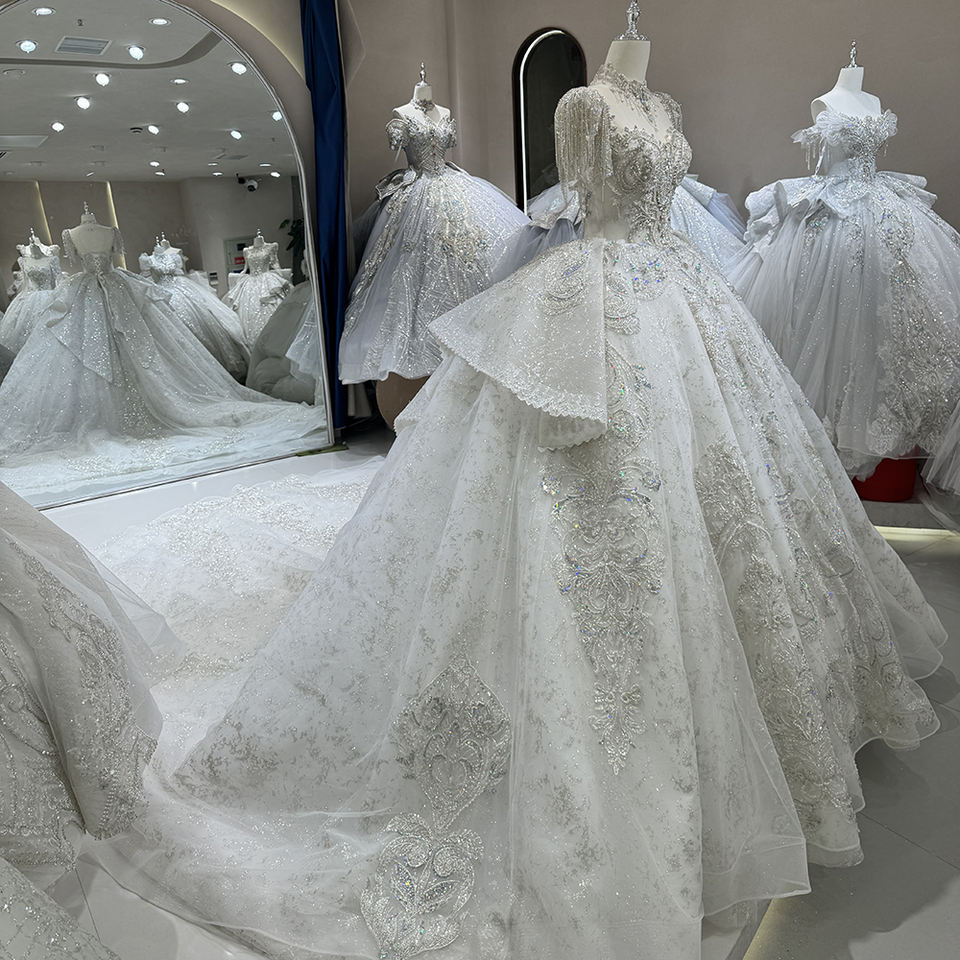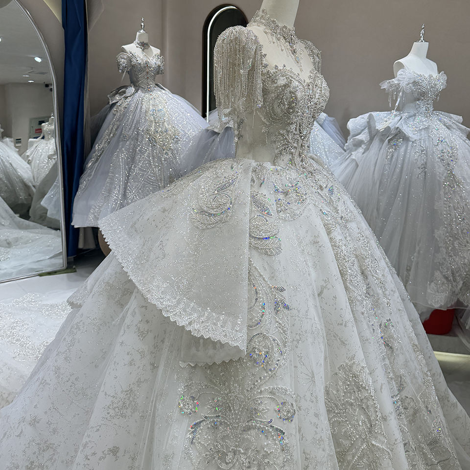 Robes de mariée de bal longues jusqu'au sol, style DW0048, taille naturelle, à volants, plissées, manches courtes, avec pampilles et sequins perlés