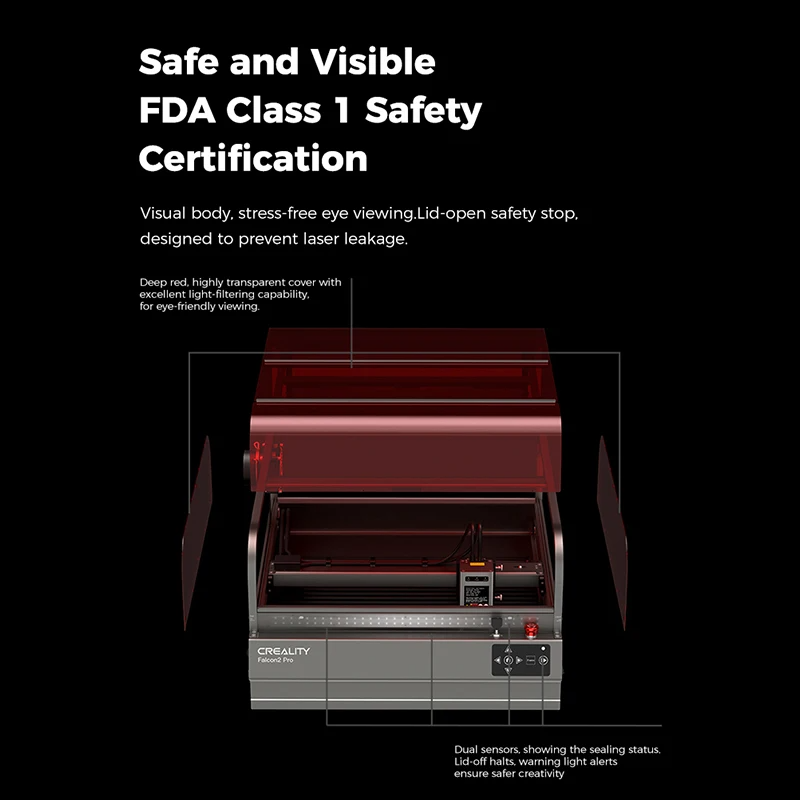 Graveur et découpeur laser CO2 Falcon 2 Pro 40W avec conception CNC fermée, surveillance visuelle à 360° et multiples fonctions de sécurité