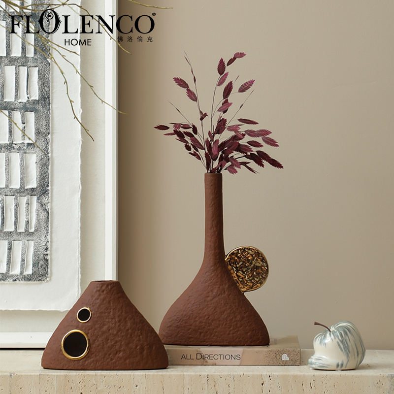 Pour Flolenco Art déco Design bouche étroite terre cuite Vase de table en céramique poignée en or scène de montagne pour la vie intérieure de la maison