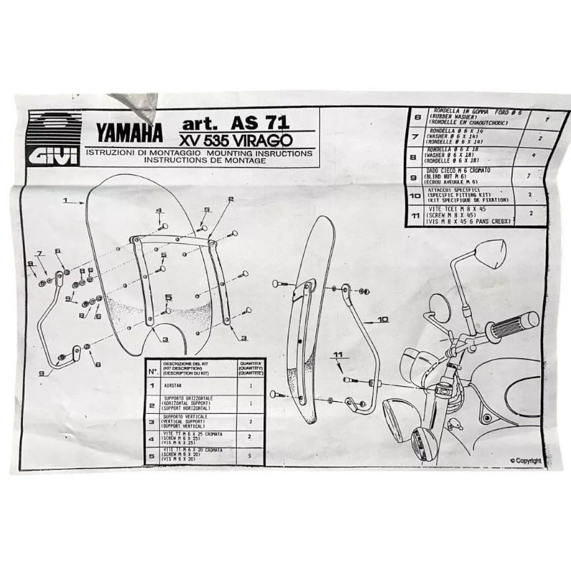 Supports spécifiques Givi AS71A pour pare-brise Yamaha XV535 Virago A12, état neuf