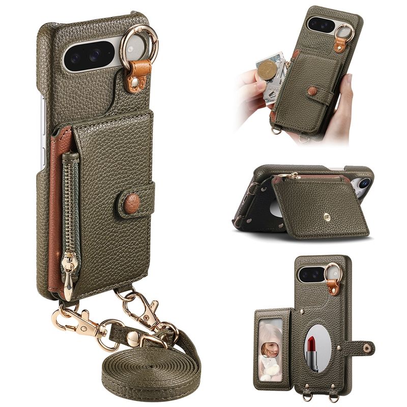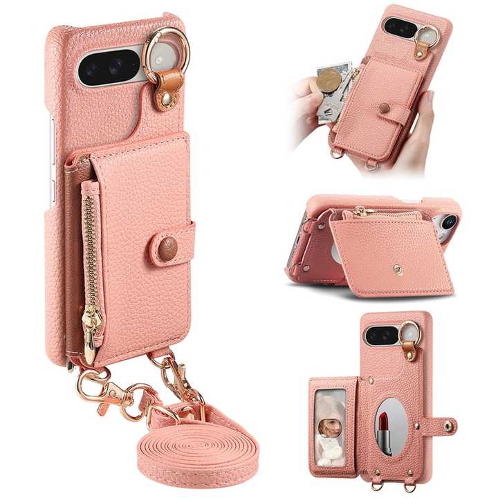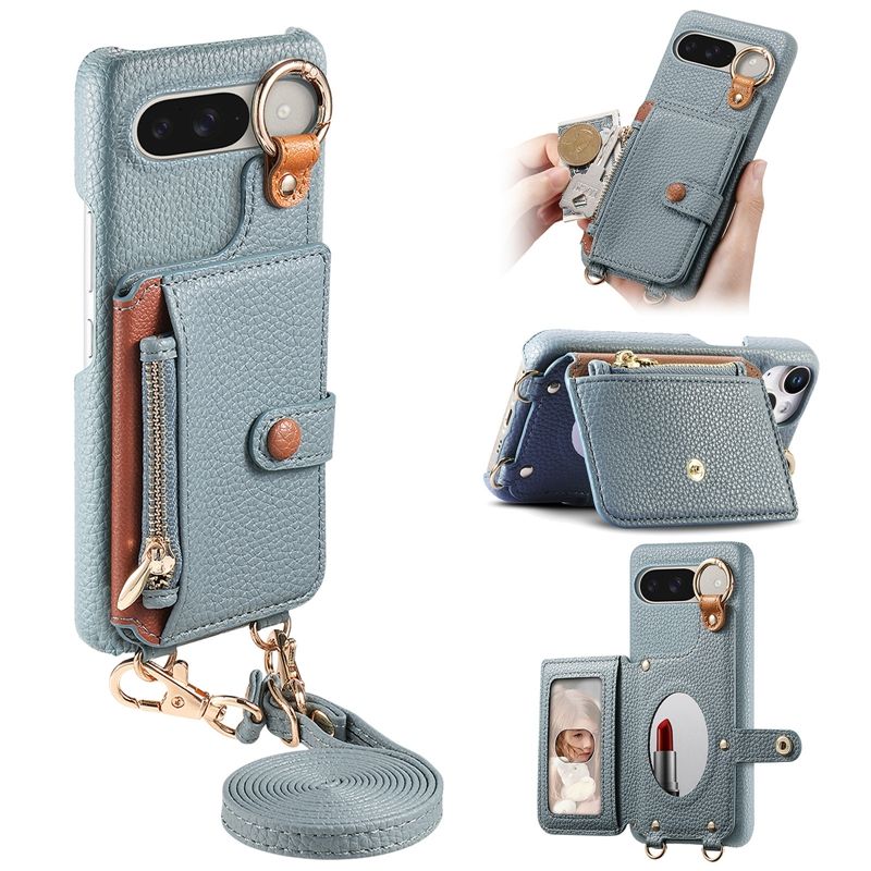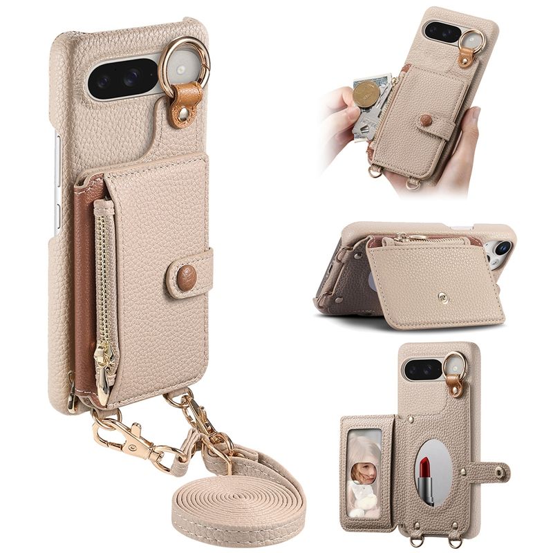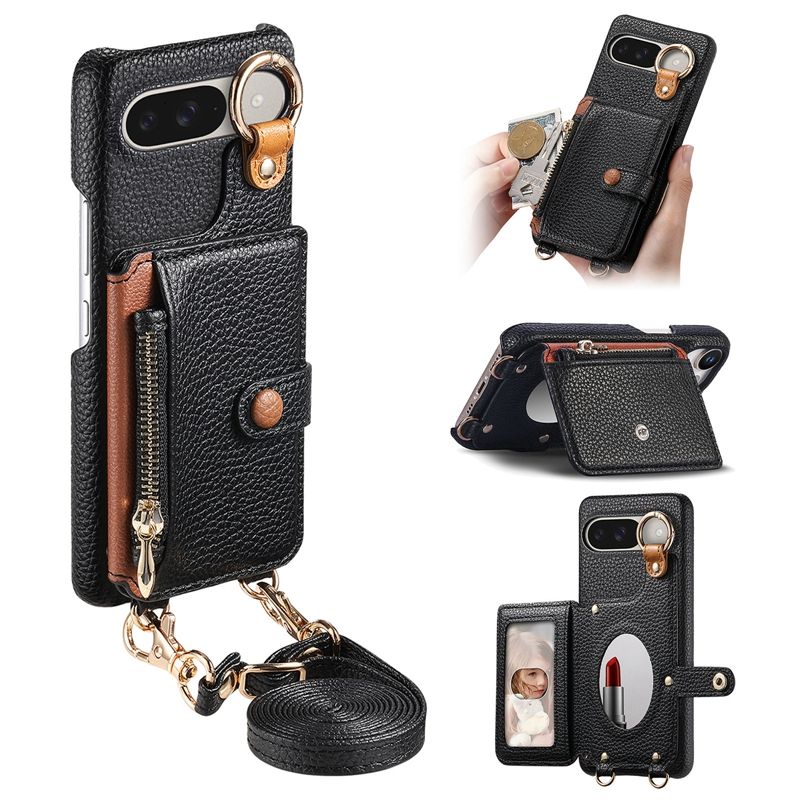 Étui portefeuille à bandoulière en cuir de litchi pour Google Pixel Pro 10 XL/9 Pro/9A/S24FE, coque arrière avec miroir