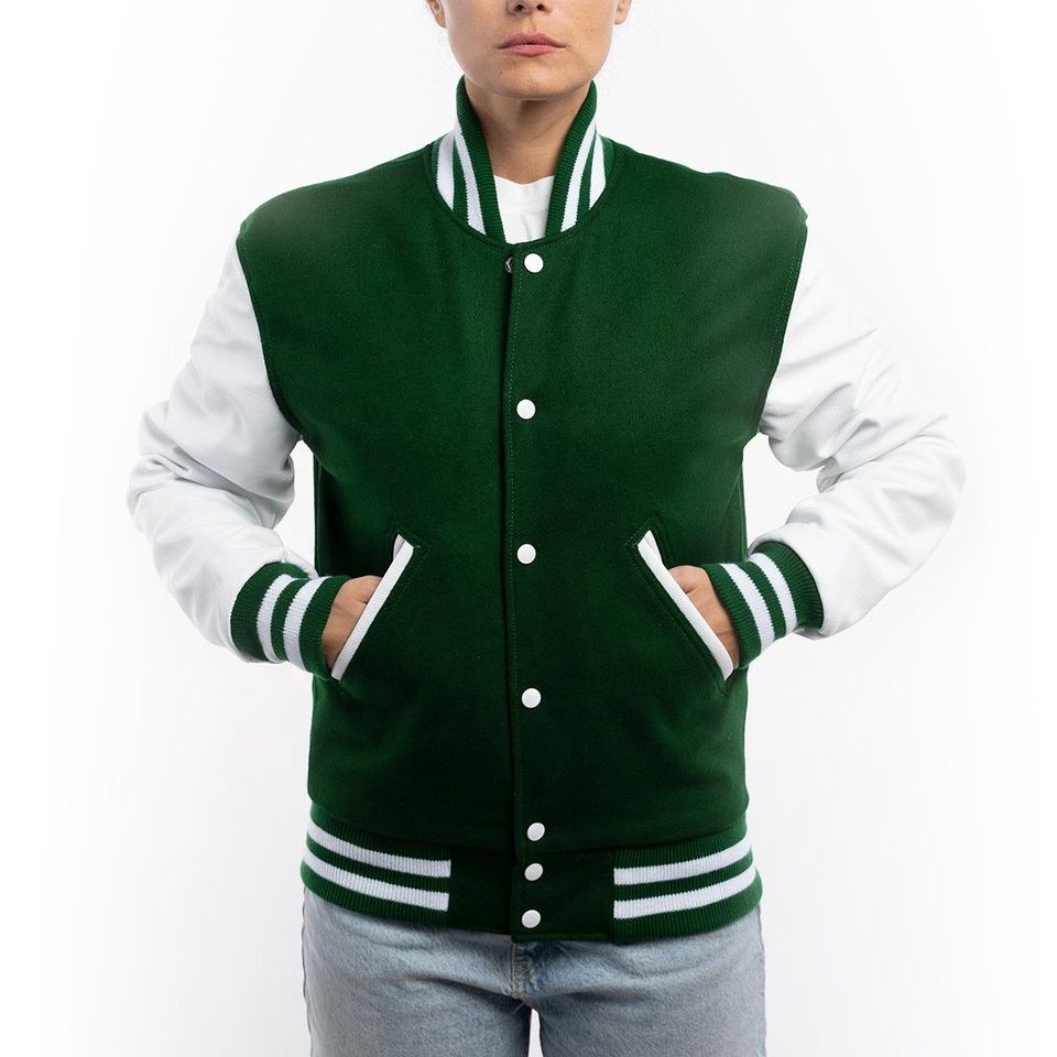 Veste universitaire pour femme, faite sur mesure, en laine verte et manches en cuir blanc brillant, respirante, coupe-vent et écologique