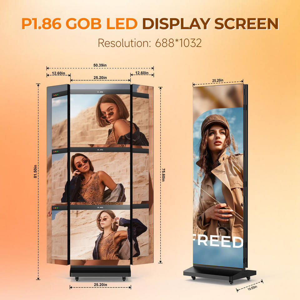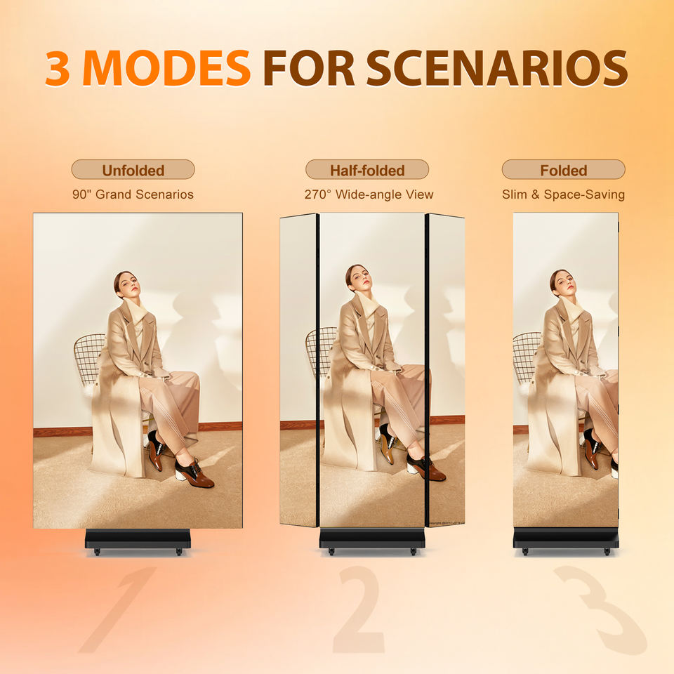 Écran publicitaire numérique LED pliable HD 3 volets P1.86, double face, avec flight case, pour affichage commercial intérieur