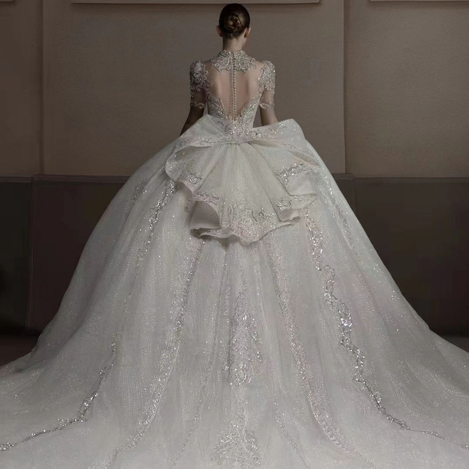 Pour Jancember LSHT047 Moderne Vintage Robe De Bal Robe De Mariée Manches Courtes Chapelle Puffy Perles Cristal Éléments Dentelle Fleur