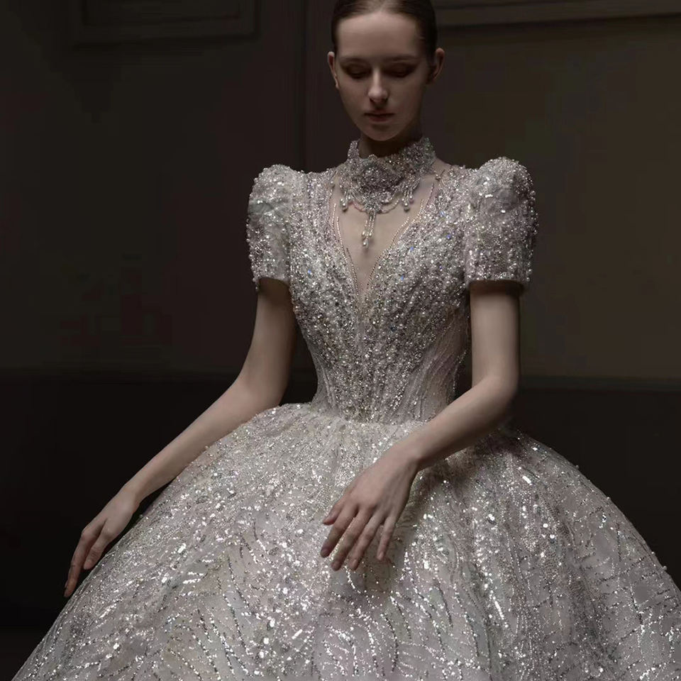 Pour Jancember LSHT049 perles luxueuses modernes perles robe de bal robe de mariée manches courtes train chapelle avec jupe longue en dentelle