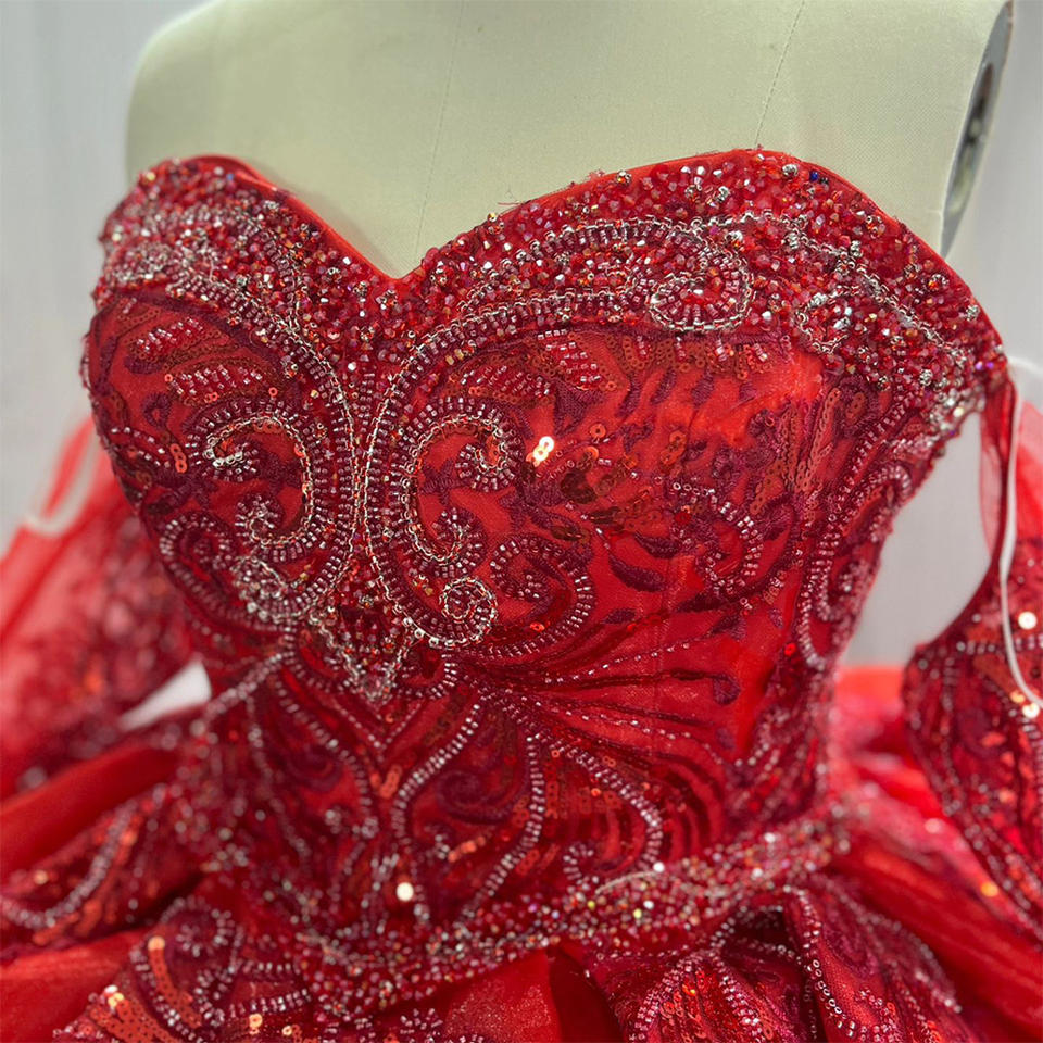 Robes de bal de Quinceañera traditionnelles en satin rouge avec des appliques de cristal et des perles, style princesse, pour LSMU14