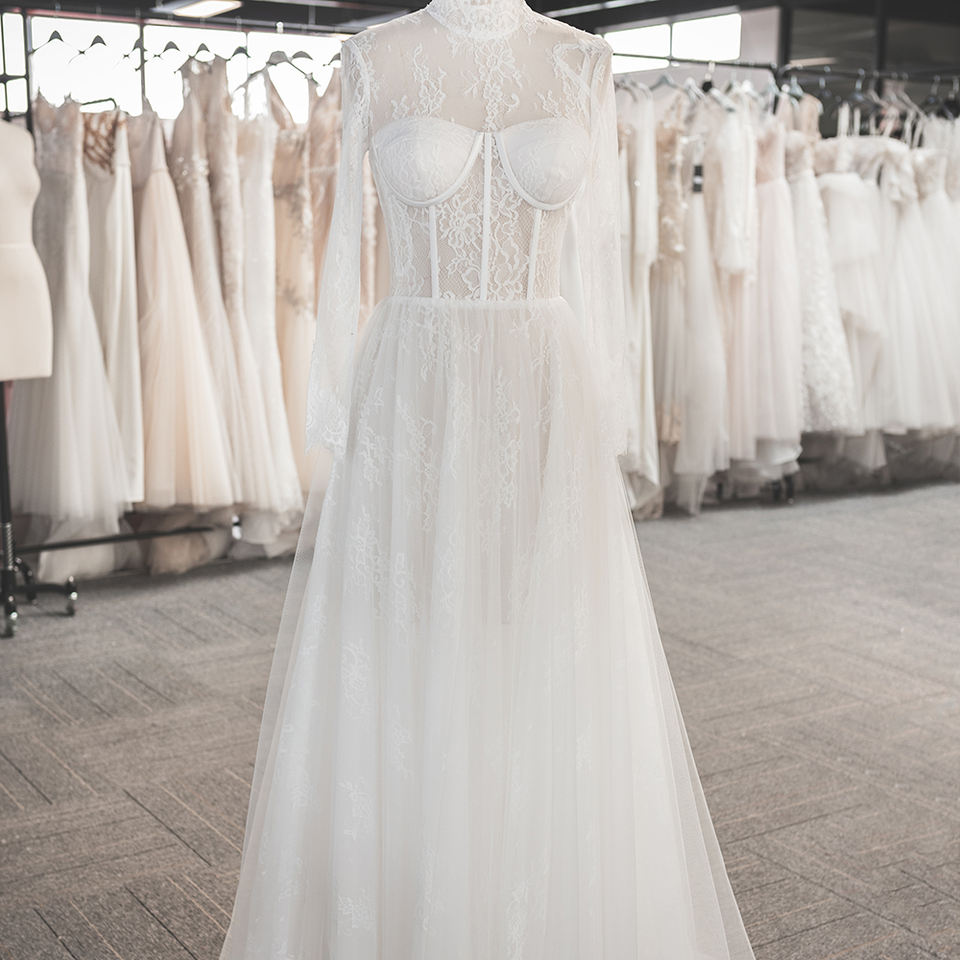 Pour LSSG042 Illusion Moderne Formelle Col Haut De Mariée A-ligne Chapelle Train Dentelle Cristal Fleurs Robes De Mariée