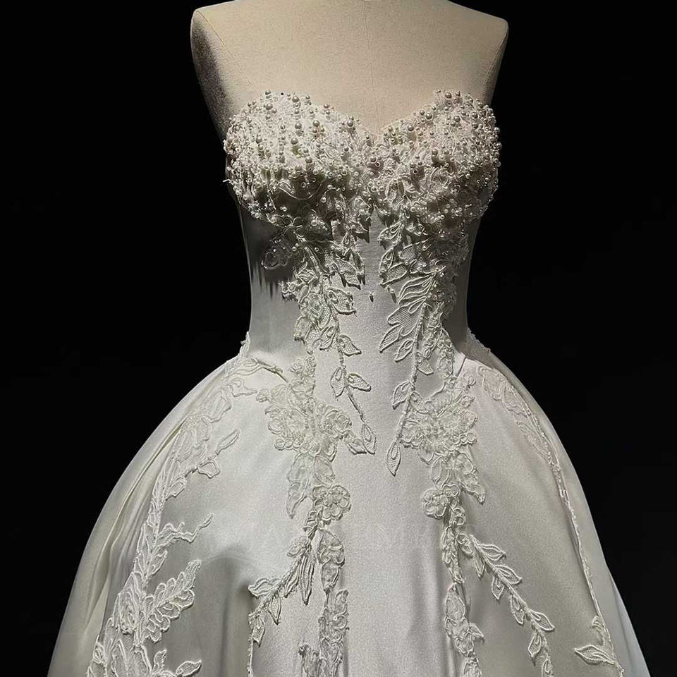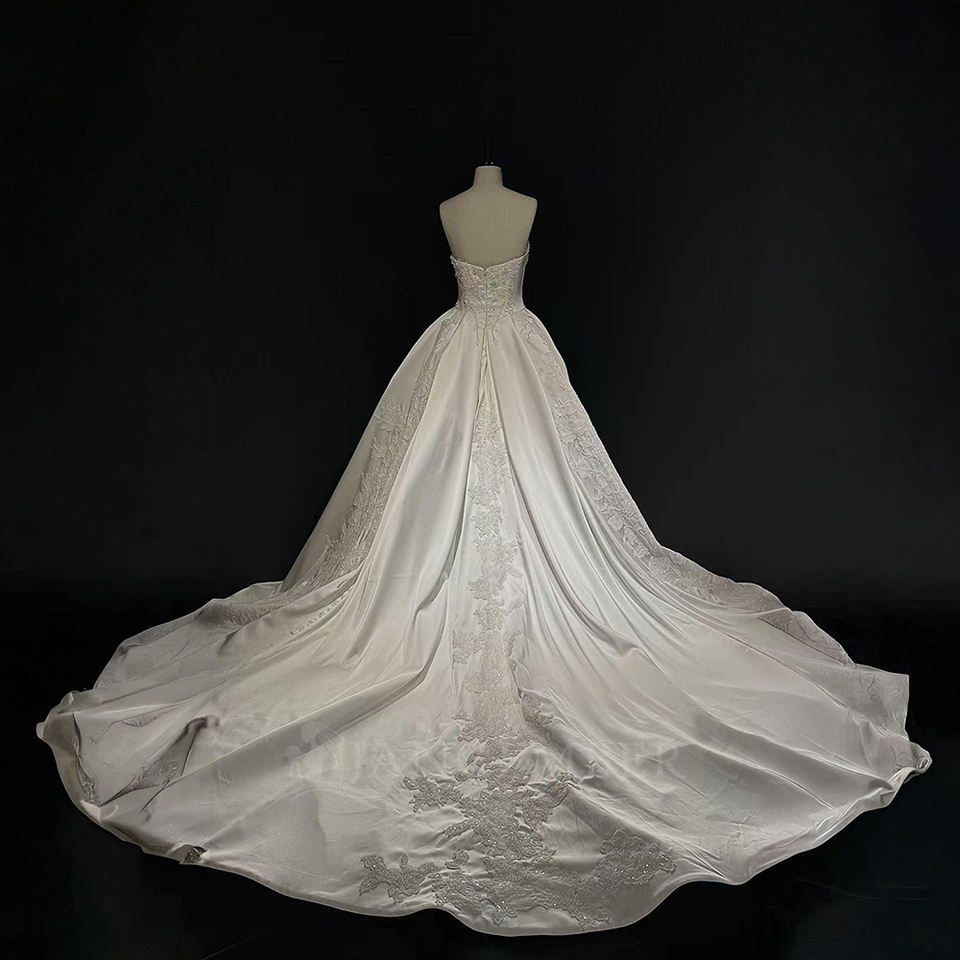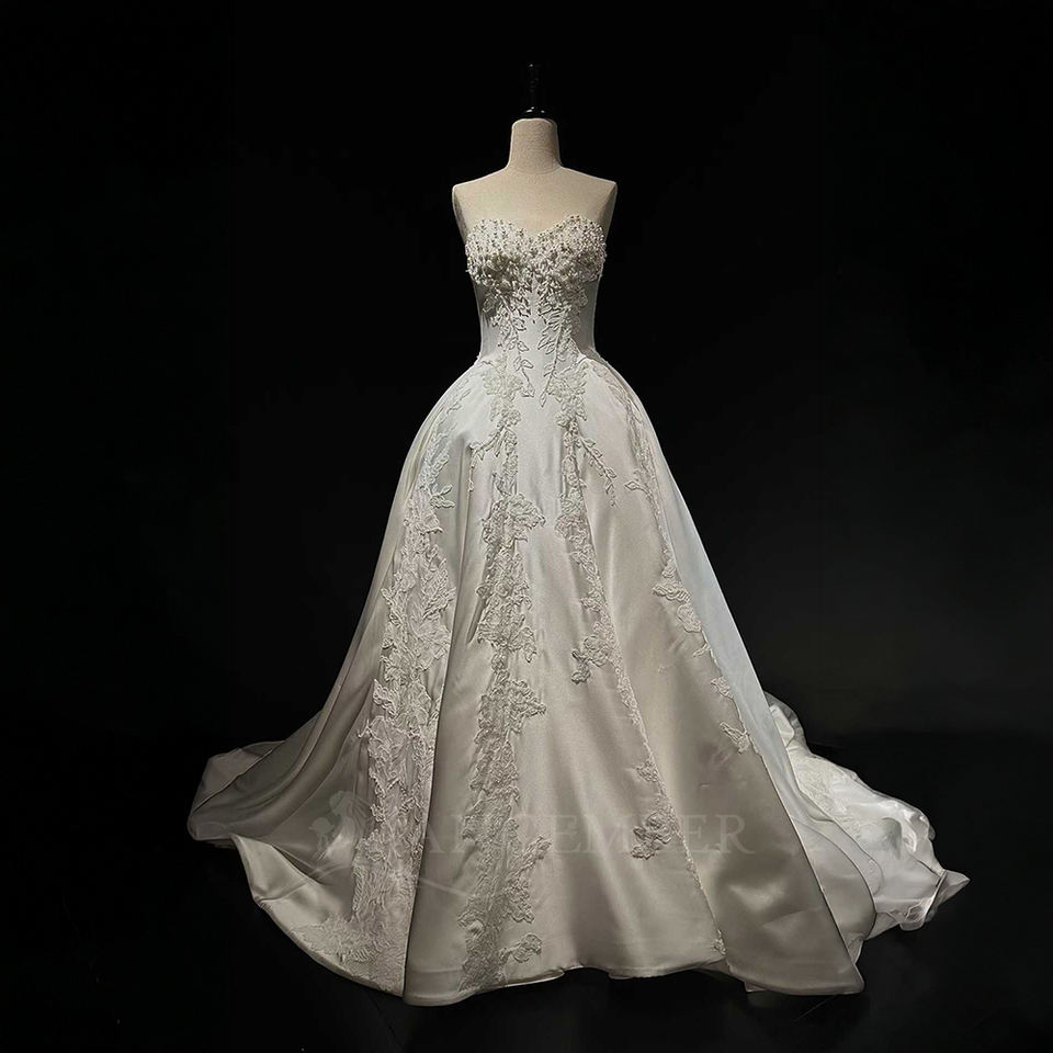 Robe de mariée moderne NT65 sans bretelles, en dentelle brodée, avec fleurs et appliques en cristal, traîne longue style chapelle