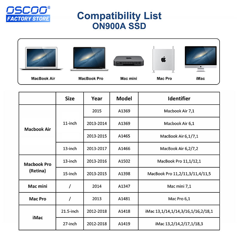 Disques durs internes SSD NVMe M.2 OSCOO de 256 Go à 2 To pour MacBook Air et MacBook Pro 13 pouces (2013-2017)
