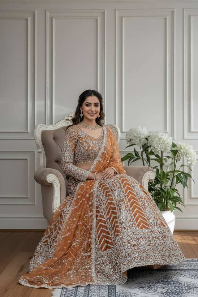 Lehenga Choli Orange FATEMA FASHION de créateur moderne avec broderie blanche complexe et travail de sequins, accompagné d'un dupatta assorti