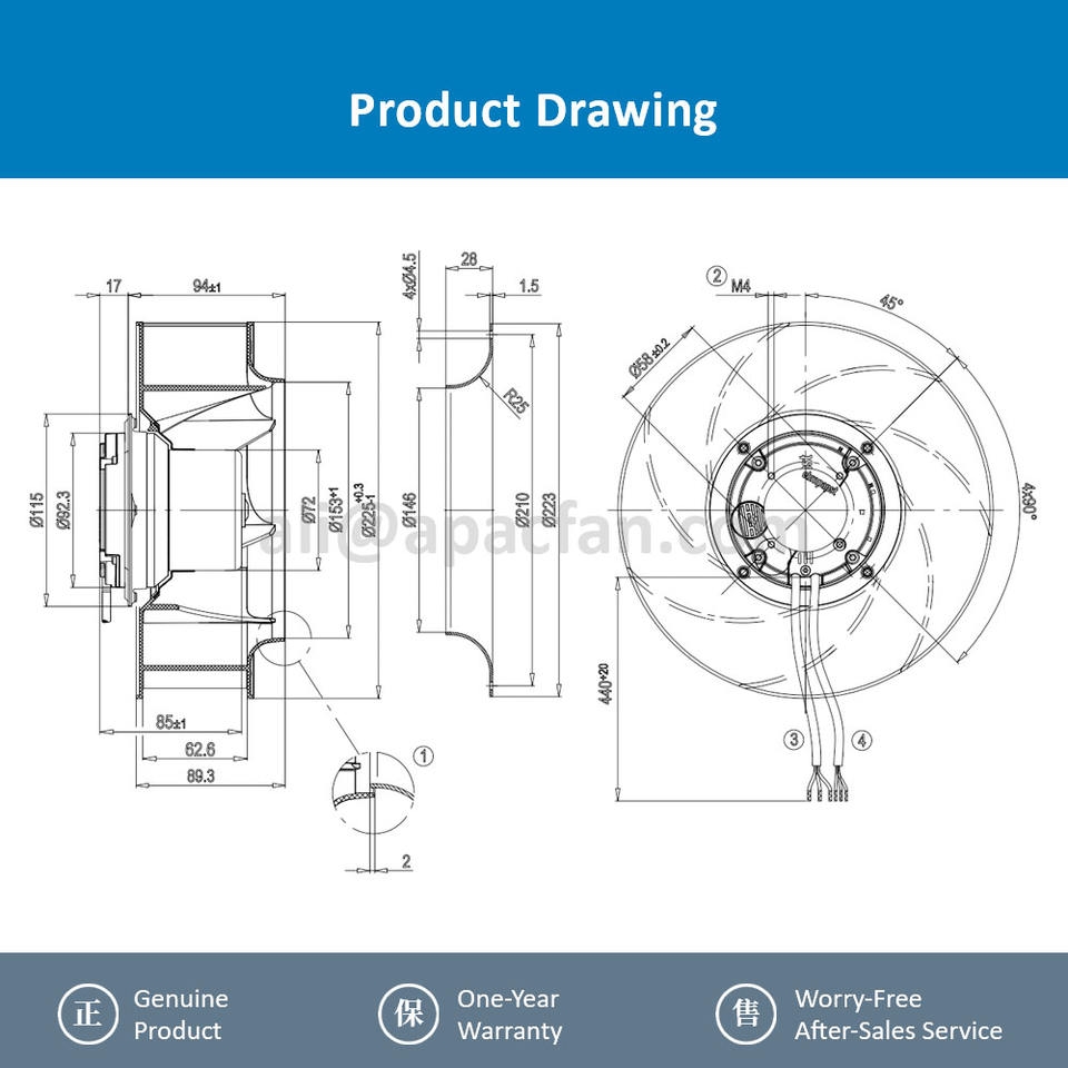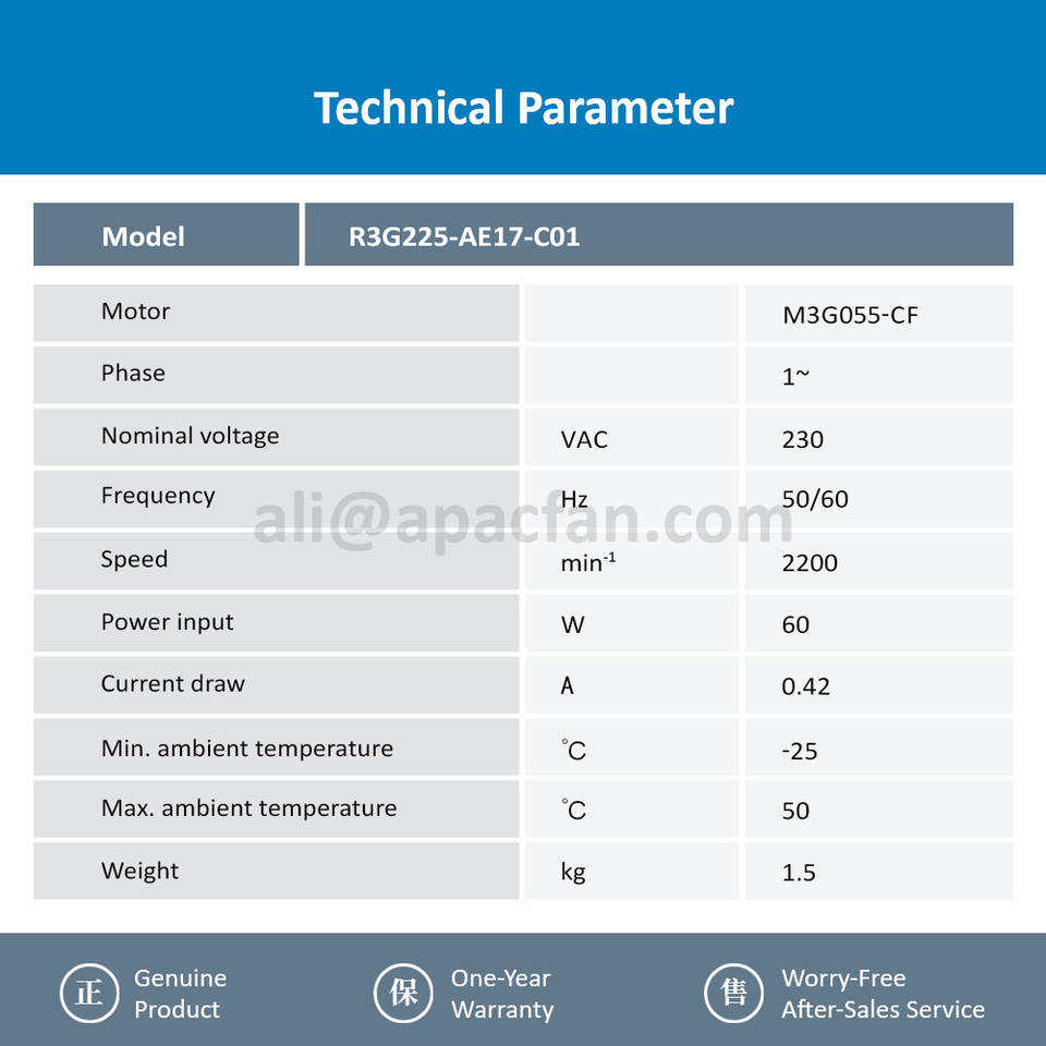 Ventilateur centrifuge de refroidissement pour climatisation et purification d'air, moteur EC OEM, pour R3G225-AE17-C01, 230 VCA, 2200 tr/min, 60 W, 0,42 A