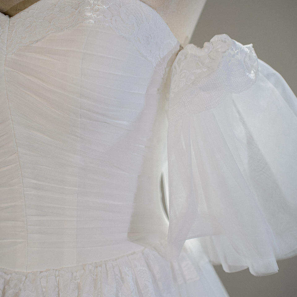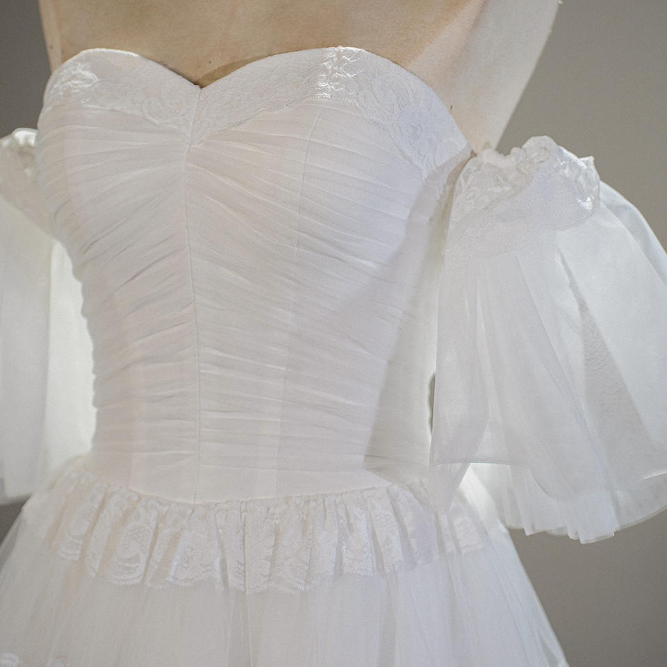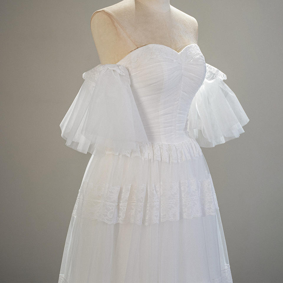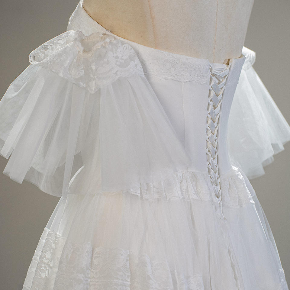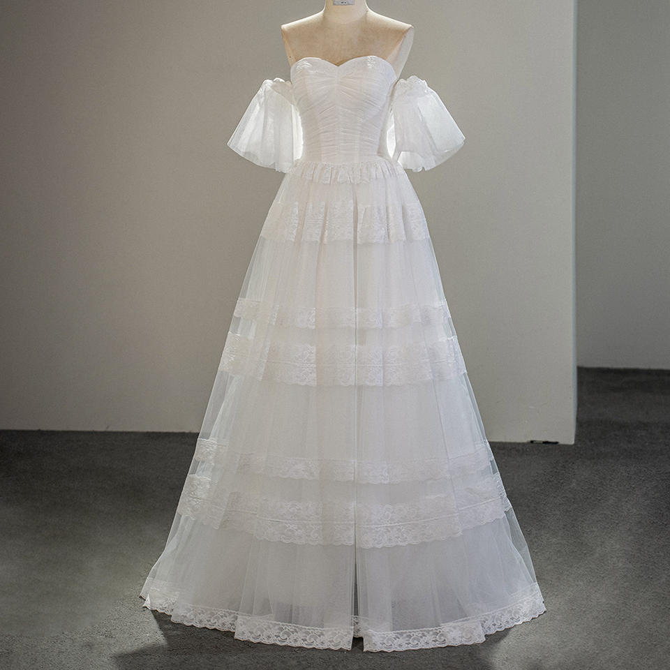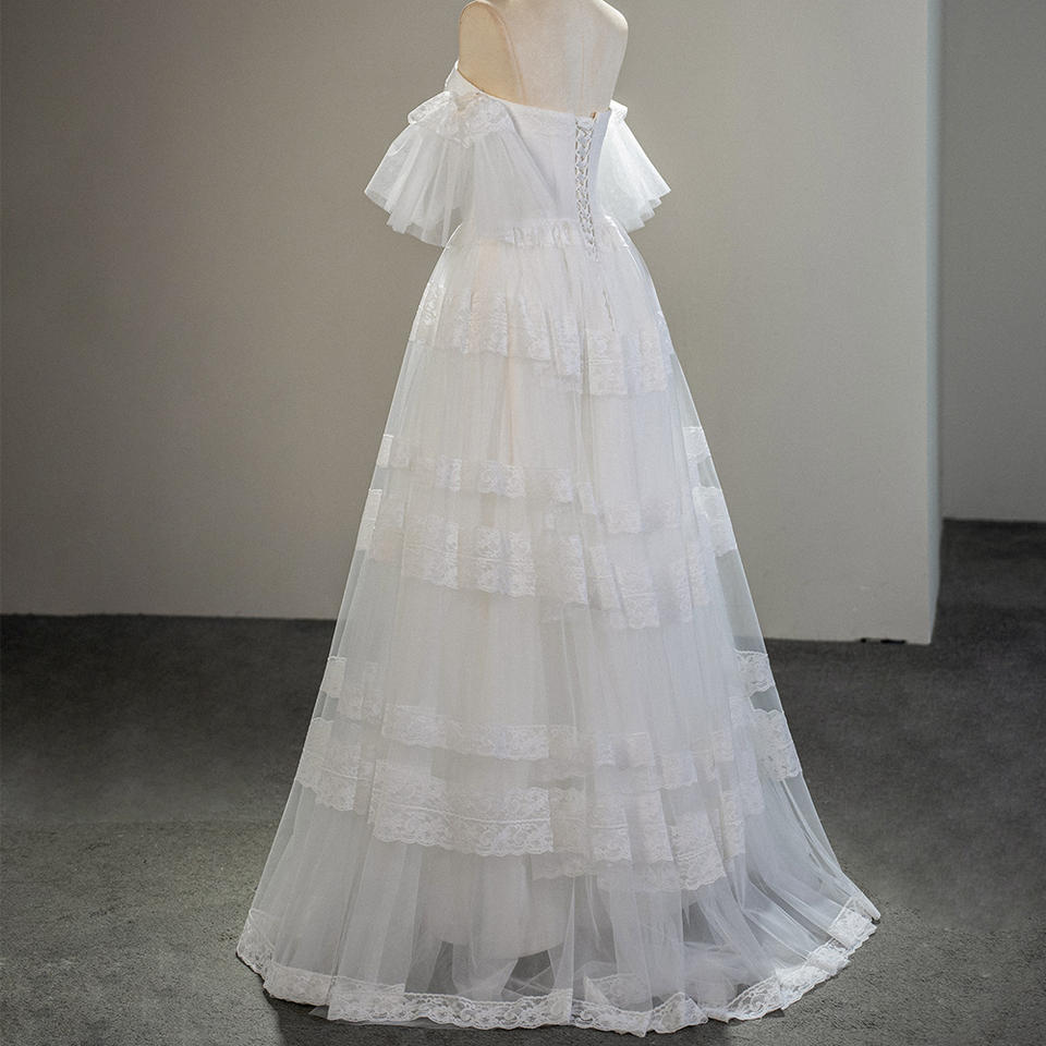 Robe de mariée princesse SFY217 coupe trapèze, longueur ras du sol, avec volants et plis, écologique et naturelle