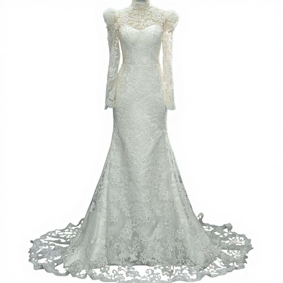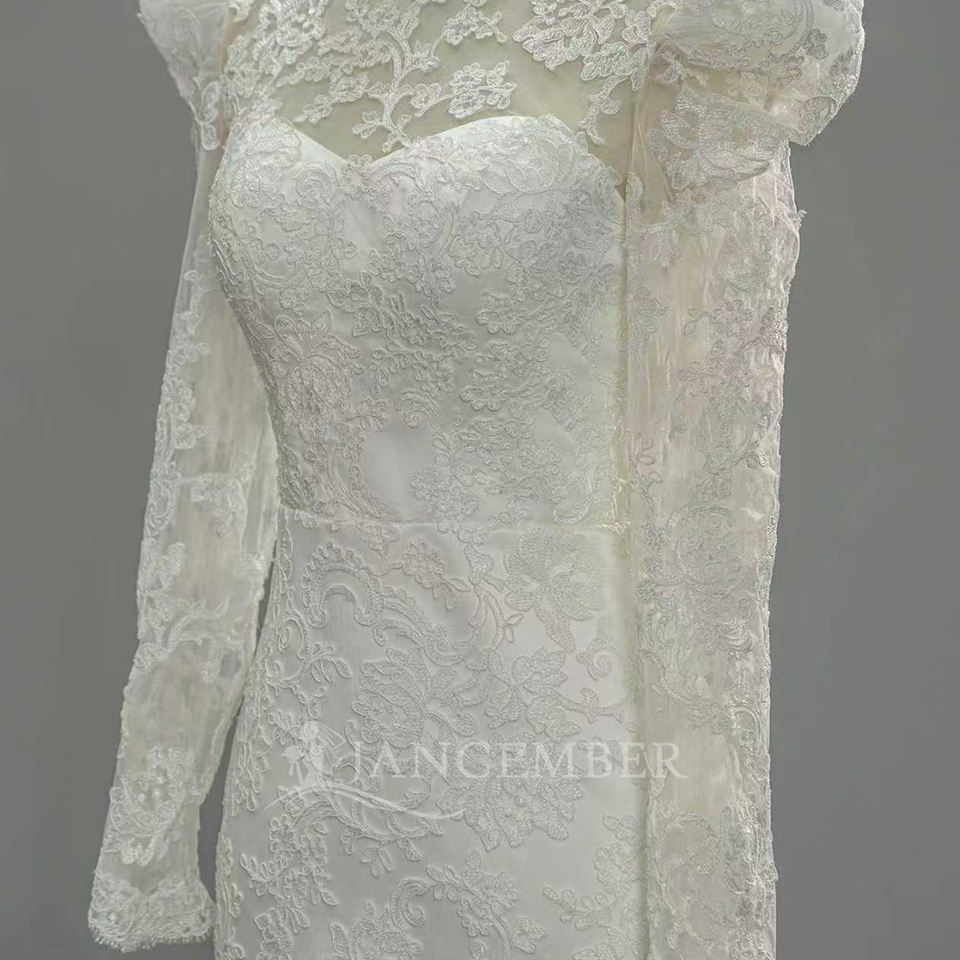 Robe de mariée SFY349 moderne et classique à col montant, broderie en dentelle, manches longues, appliques florales en cristal, traîne chapelle