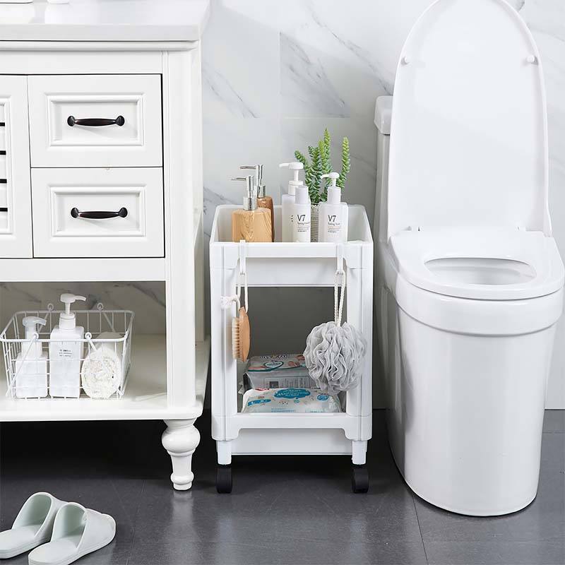 À vendre un support de rangement portable à deux couches avec roues et petites étagères pliables en plastique pour salles de bain