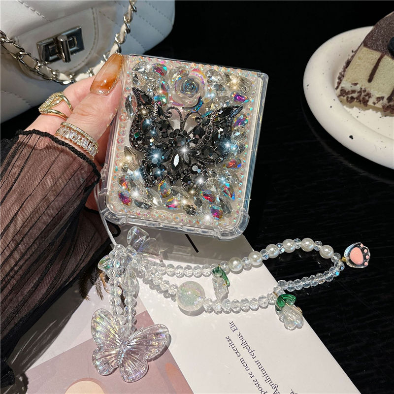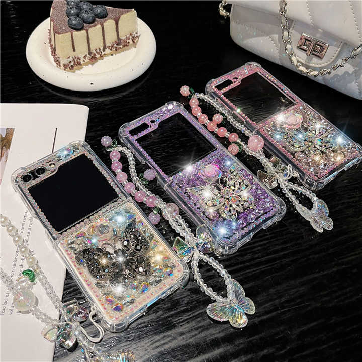 Pour Samsung Z Flip 5 Case Diamond Glitter Bling Butterfly Wrist Chain Phone Case Pour Samsung Z Flip 4 3 Shell Cases