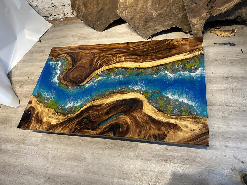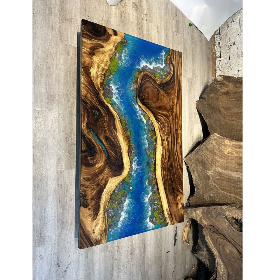 Pour les concepts d'intérieur scandinave et japonais contemporains, plateau de table en bois avec résine époxy, esthétique minimaliste