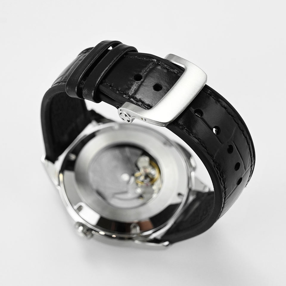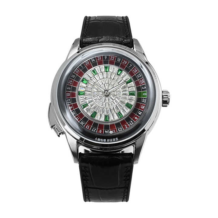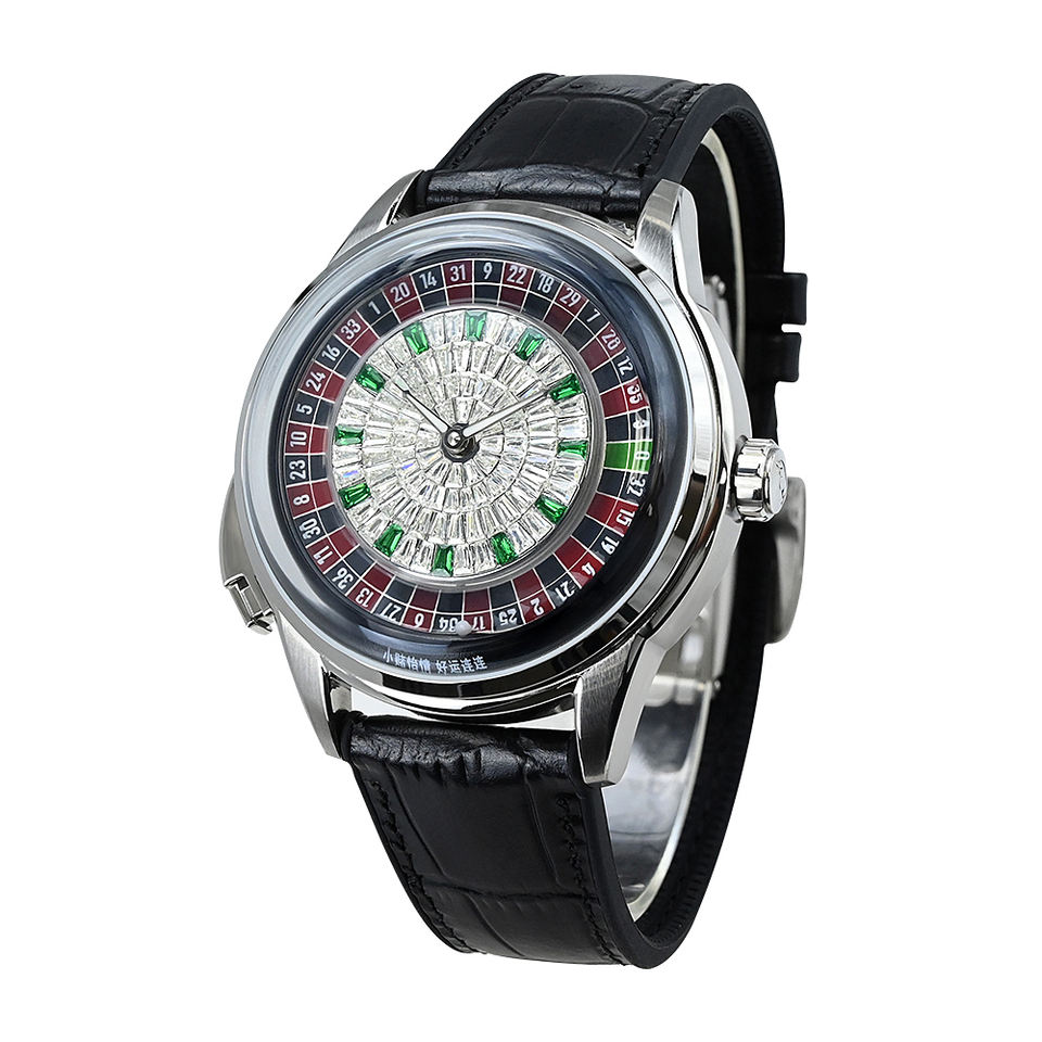 Montre-bracelet mécanique pour homme en cuir, avec verre minéral, style casino, diamant, bouton européen, pour le sport et le jeu de roulette analogique