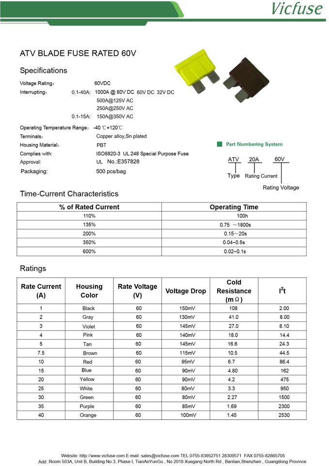 Pour les fusibles à lame ATV à courant élevé certifiés UL 60V DC ISO8820-3 conformes pour une utilisation de qualité automobile