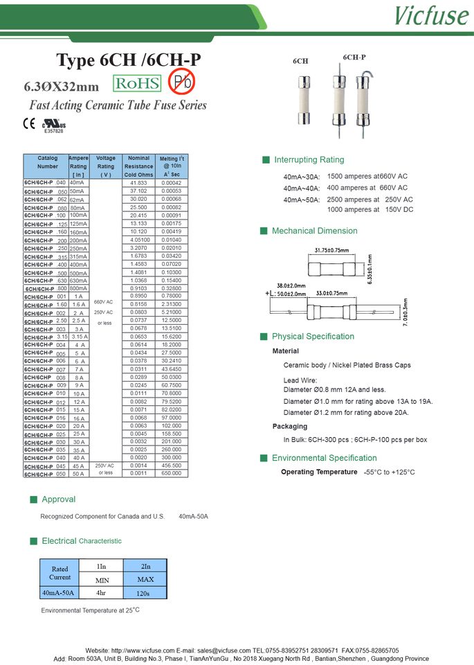 Pour fusible de Tube en céramique 6CH à action rapide reconnu UL capacité d'interruption élevée 40mA-50A 660V/250V AC produit certifié RoHS