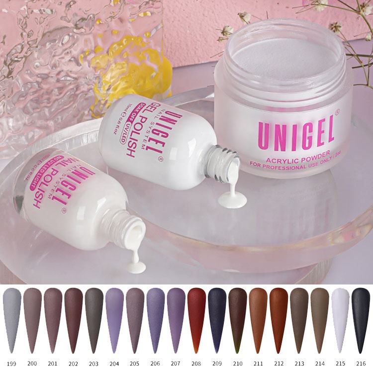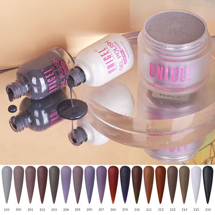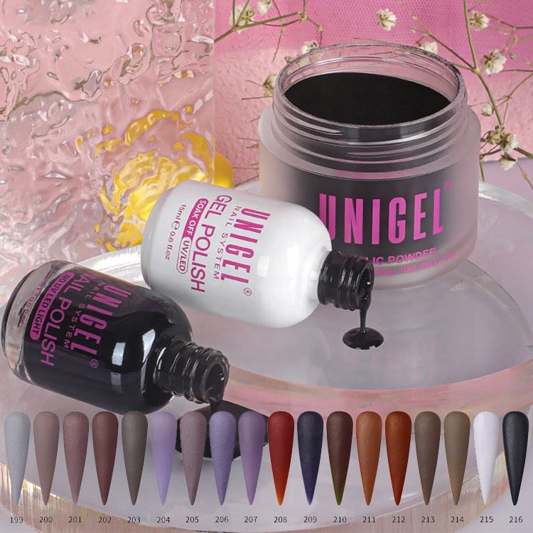Pour la marque privée Unigel # 199- # 216 Vernis à ongles UV 3 en 1 assorti à la poudre acrylique et au vernis à ongles Vagan pour l'art des ongles
