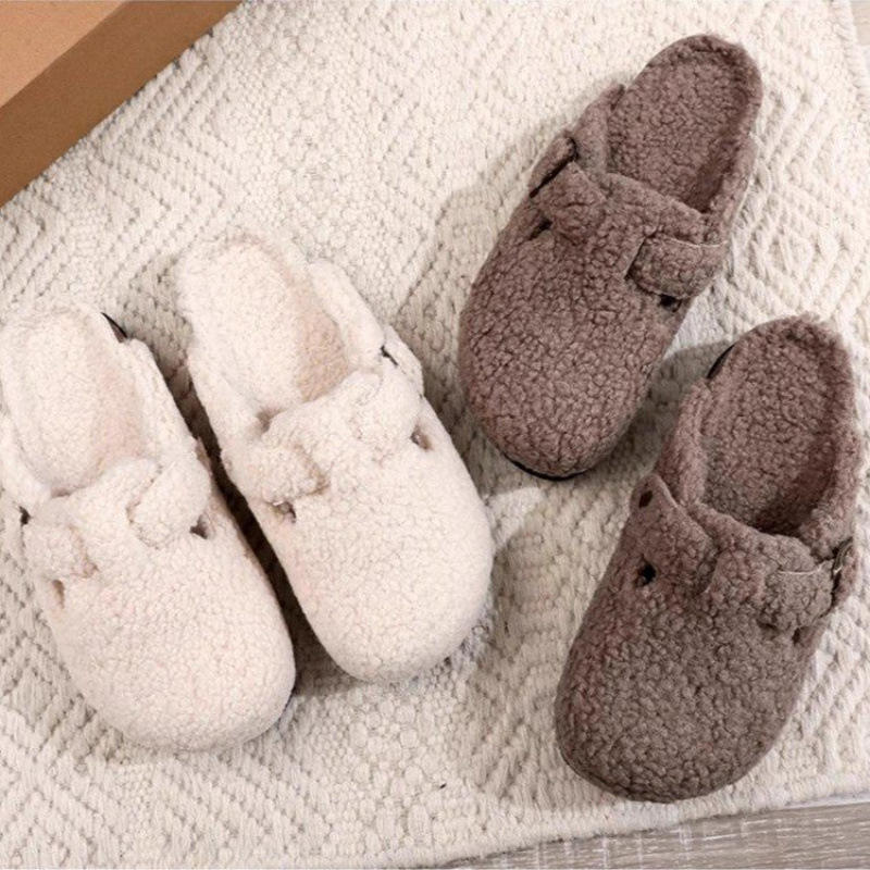 Nouvelles sandales d'hiver 2024 pour femmes, à semelle épaisse, en velours chaud, avec orteils séparés, blanches/marron