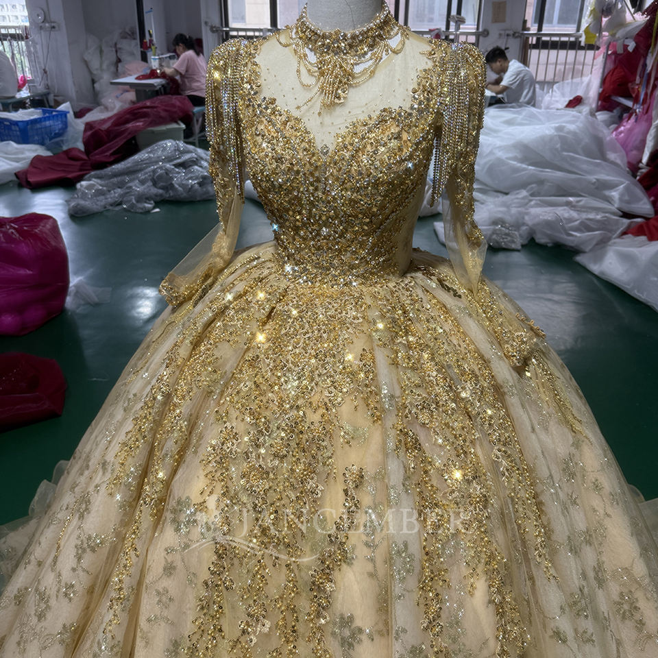 For XS177 Golden Crystal Empire Evening Women Traditional Tassel Ball Gown Natural Waist Party Floor-Length Organza Chapel