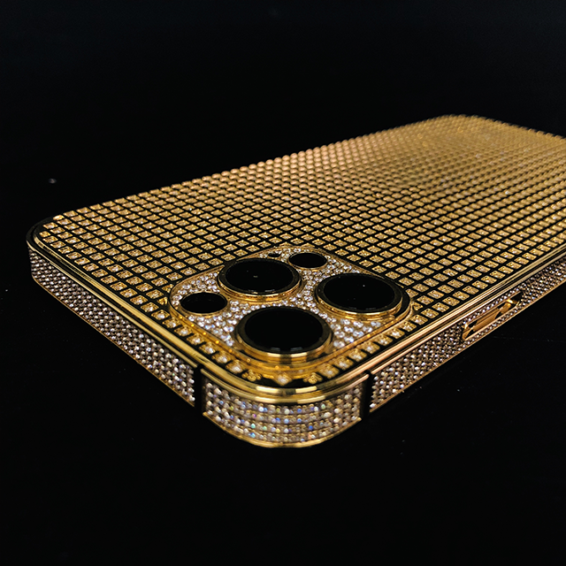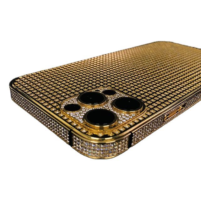 Pour iPhone 11, 12, 13 et 14 Series, boîtier de téléphone portable de luxe plaqué or 24 carats avec cadre doré entièrement serti