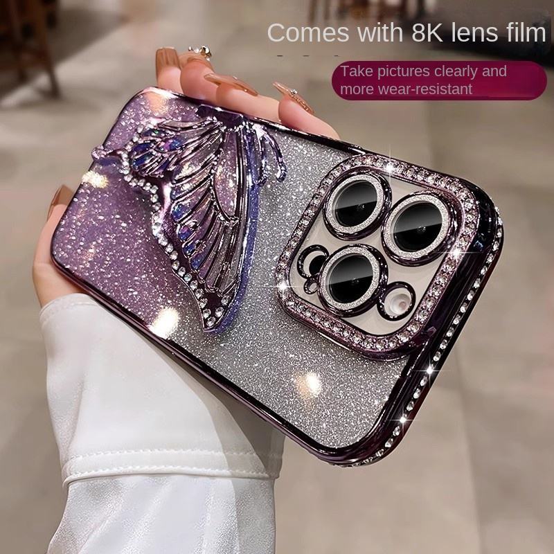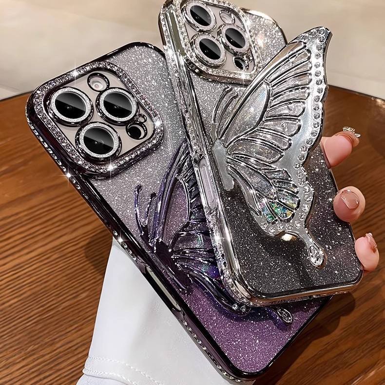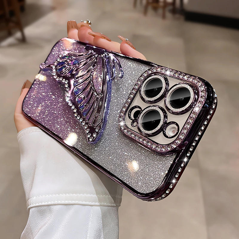 Pour iPhone 15 Pro QuickSand Butterfly Bracket Soft TPU Case avec Galvanoplastie Anti-Chute Feature Camera Protector pour iPhone 15