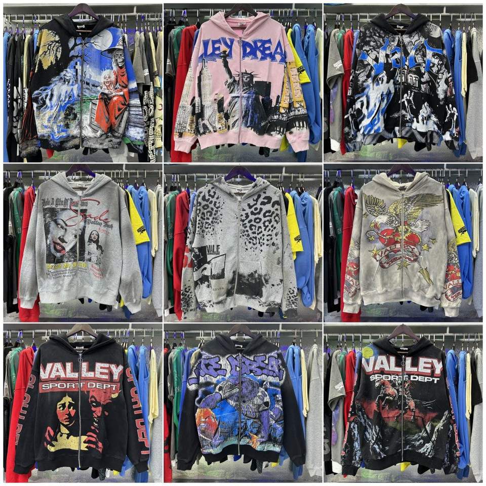 Sweat-shirt ample en coton platine à fermeture éclair, style américain, imprimé vintage, tendance streetwear, décontracté, avec fourrure de lapin, pour le commerce extérieur