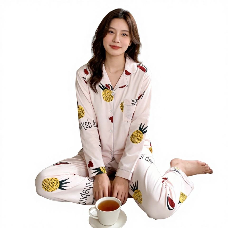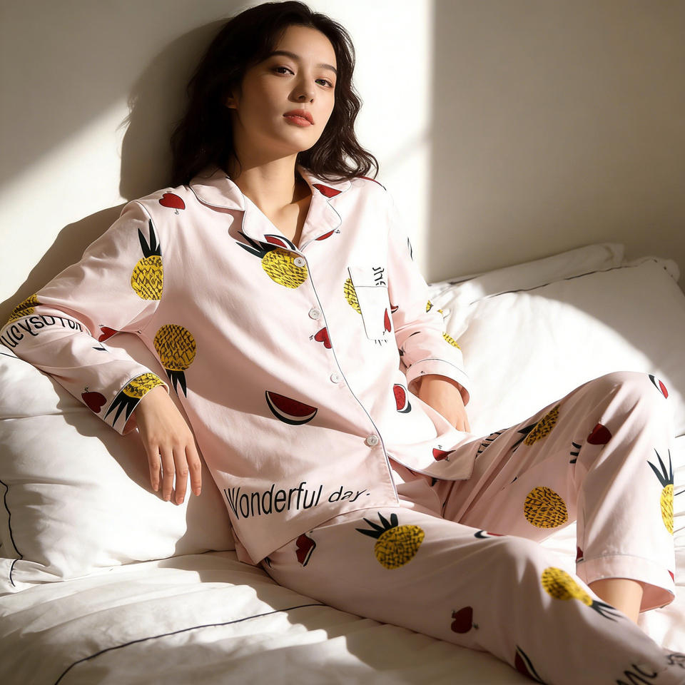 Vente directe à l'exportation : Cardigan long à revers pour femme, printemps, coupe ample, motif ananas dessin animé mignon, style étudiant, vêtements d'intérieur