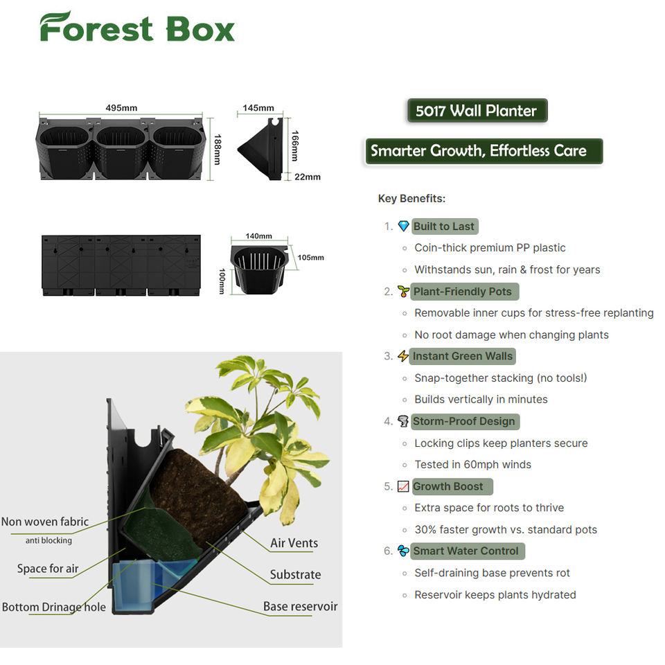 Jardinière Murale Suspendue Auto-Arrosante Forest Box, Système de Jardin Vertical Modulaire Empilable Sans Brevet avec Trou de Drainage