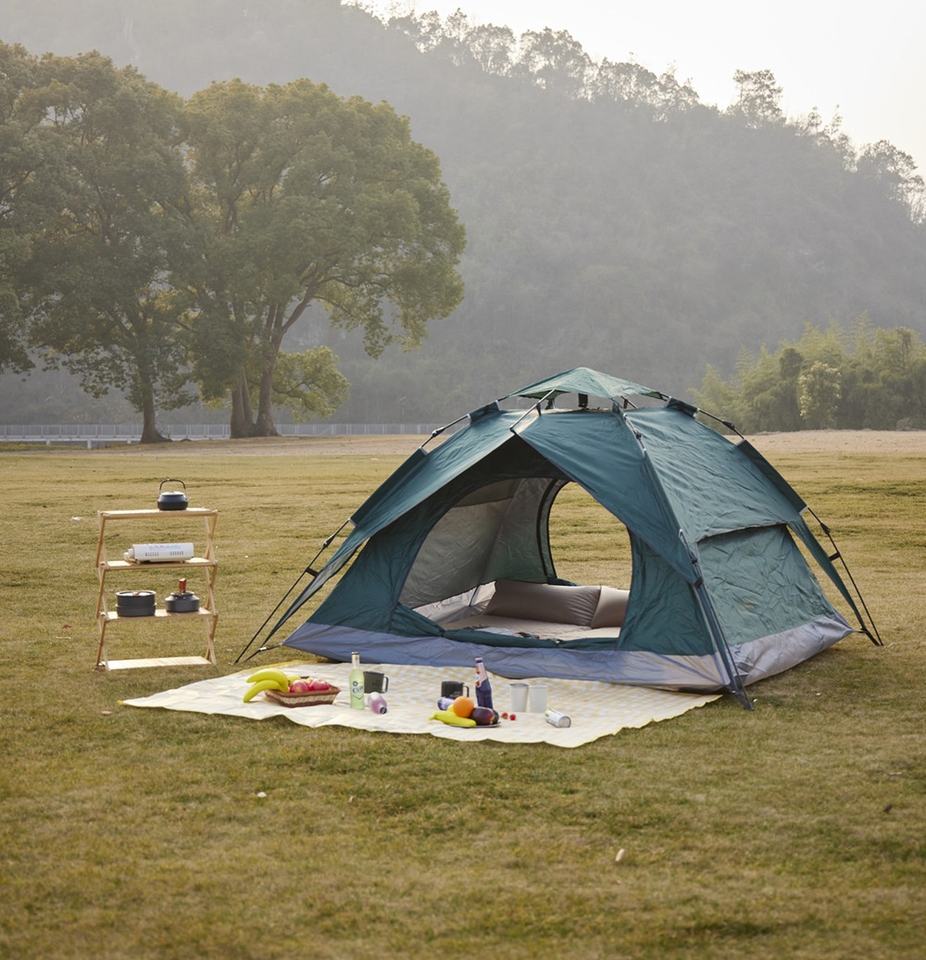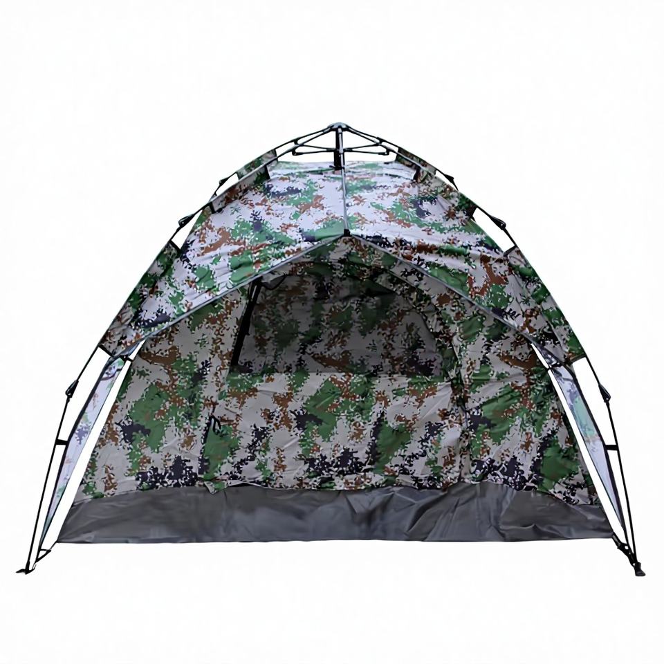 Tente de camping à double couche vert forêt à montage rapide avec bordure en maille 360°, tissu Oxford imperméable, cadre en acier pour utilisation en extérieur