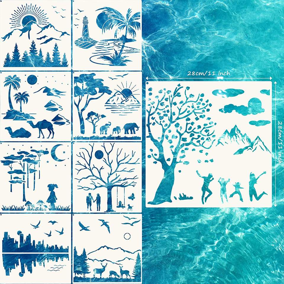 Pochoirs de paysage forestier, montagnes, rivières, avec anneau métallique, modèles de nature réutilisables pour la peinture sur bois, décoration murale