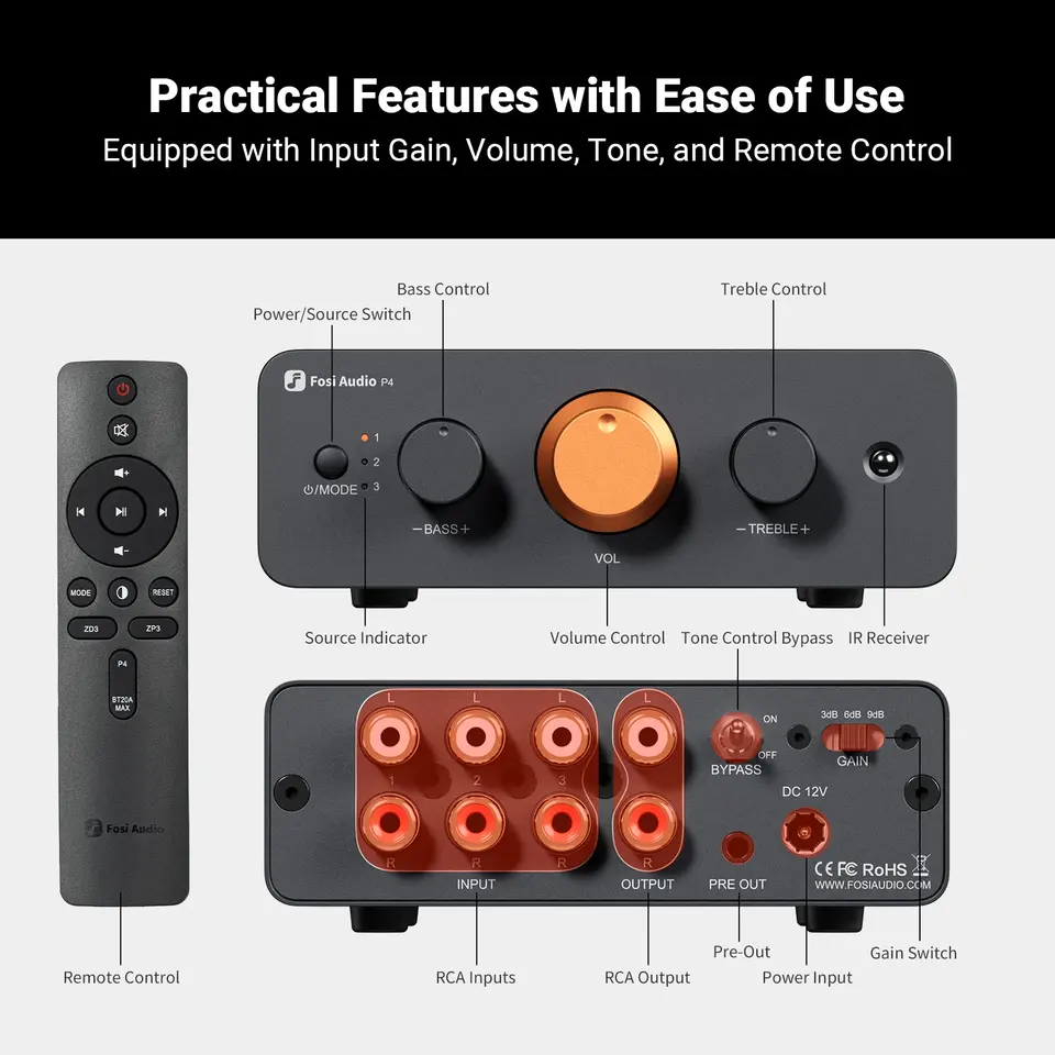 Préamplificateur HiFi Fosi Audio P4 : 3 entrées RCA, op-amps interchangeables, égaliseur/bypass, contrôle des aigus et des basses pour systèmes audiophiles