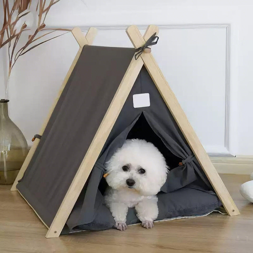 Tente tipi pour animaux de compagnie en bois massif universelle quatre saisons avec coussin amovible lavable pour animaux de compagnie pesant jusqu'à 10 kg