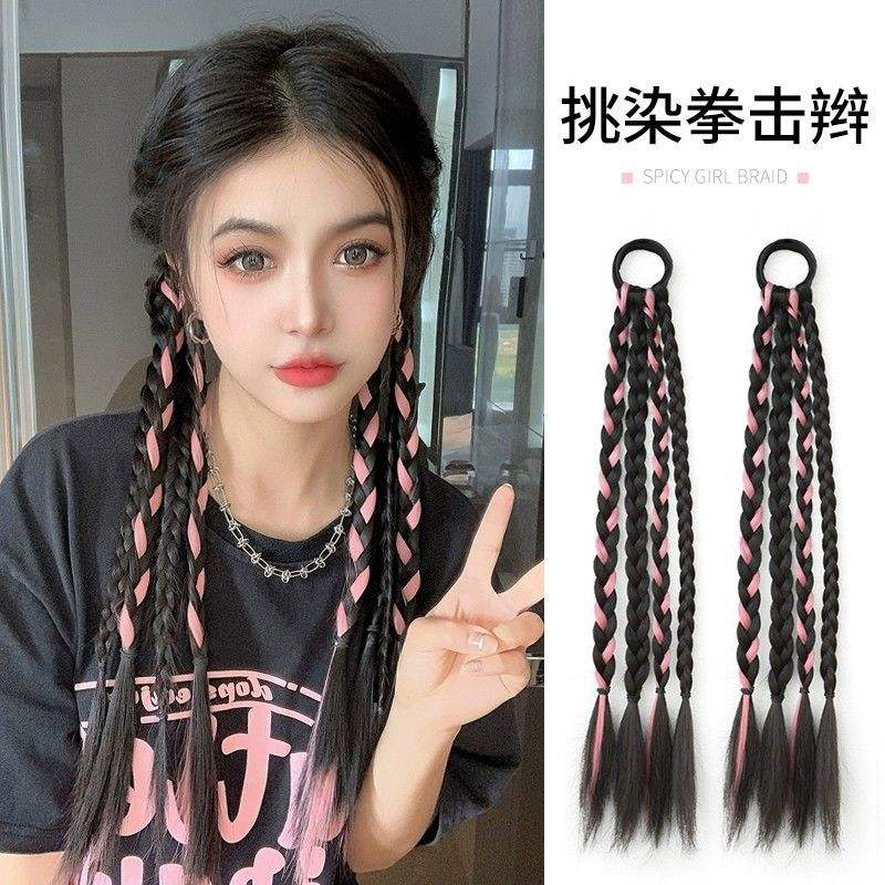Perruque queue de cheval haute à quatre tresses, ombré noir et rose, cheveux tressés à la main pour femme, style doux et cool, aspect naturel invisible