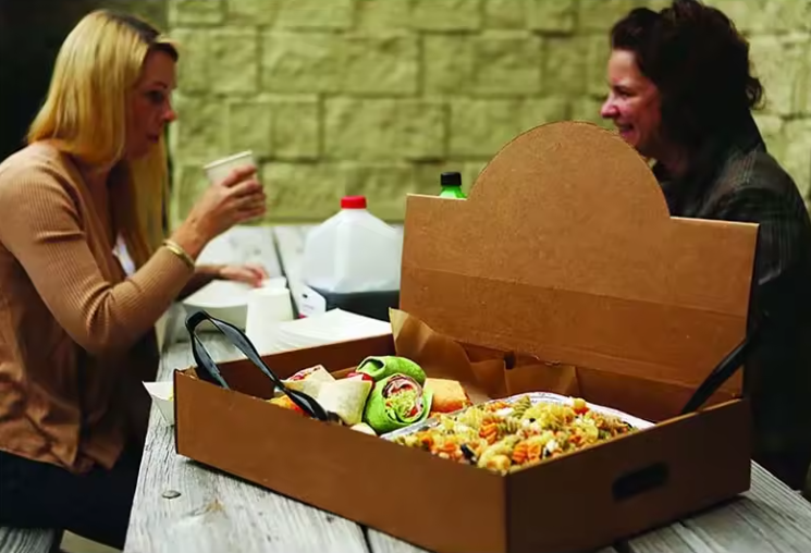 Boîte de présentation alimentaire en carton pop-up à quatre coins, adaptée aux aliments et aux boissons, avec laminage mat, et pliable.