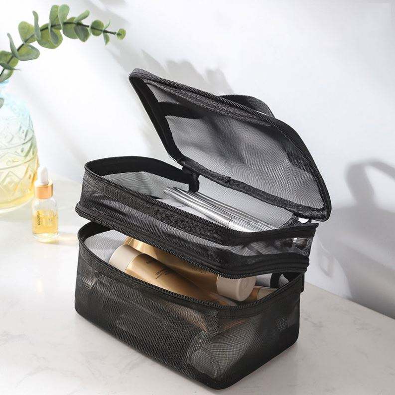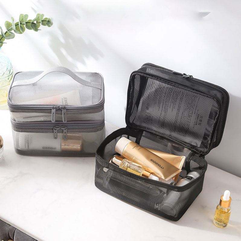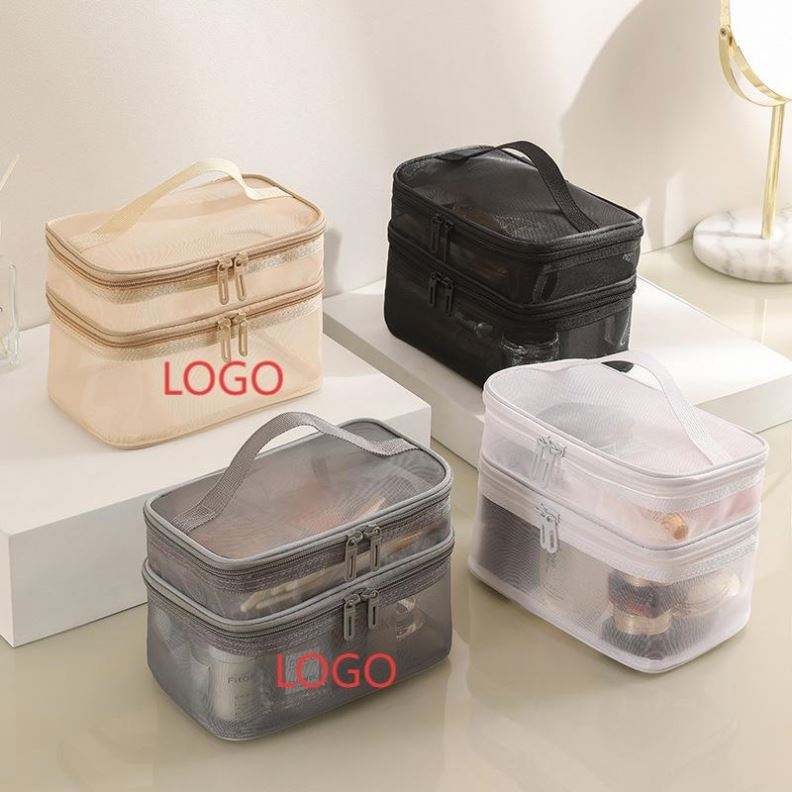 Sac de toilette transparent en maille avec logo personnalisé gratuit, facile à nettoyer, portable, durable, organiseur de cosmétiques, trousse de maquillage