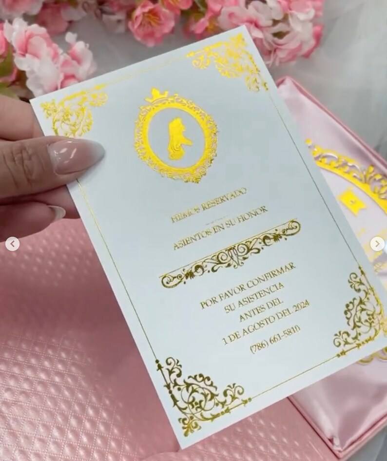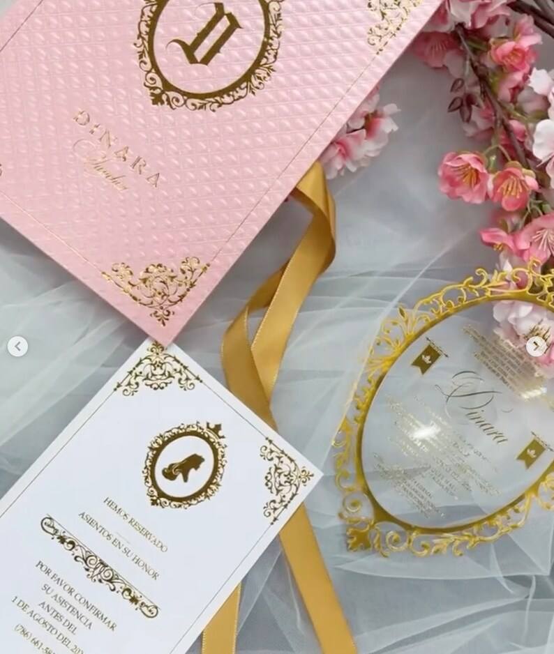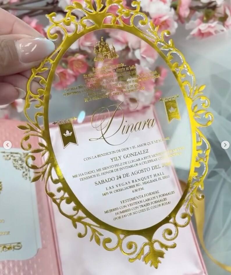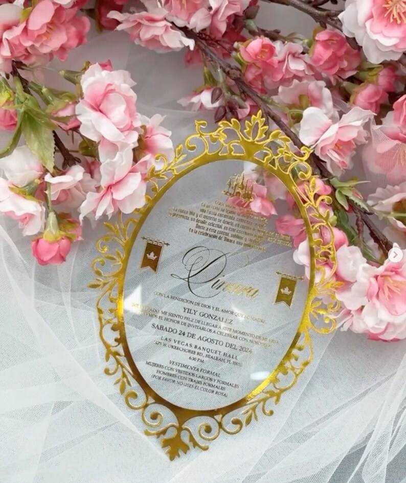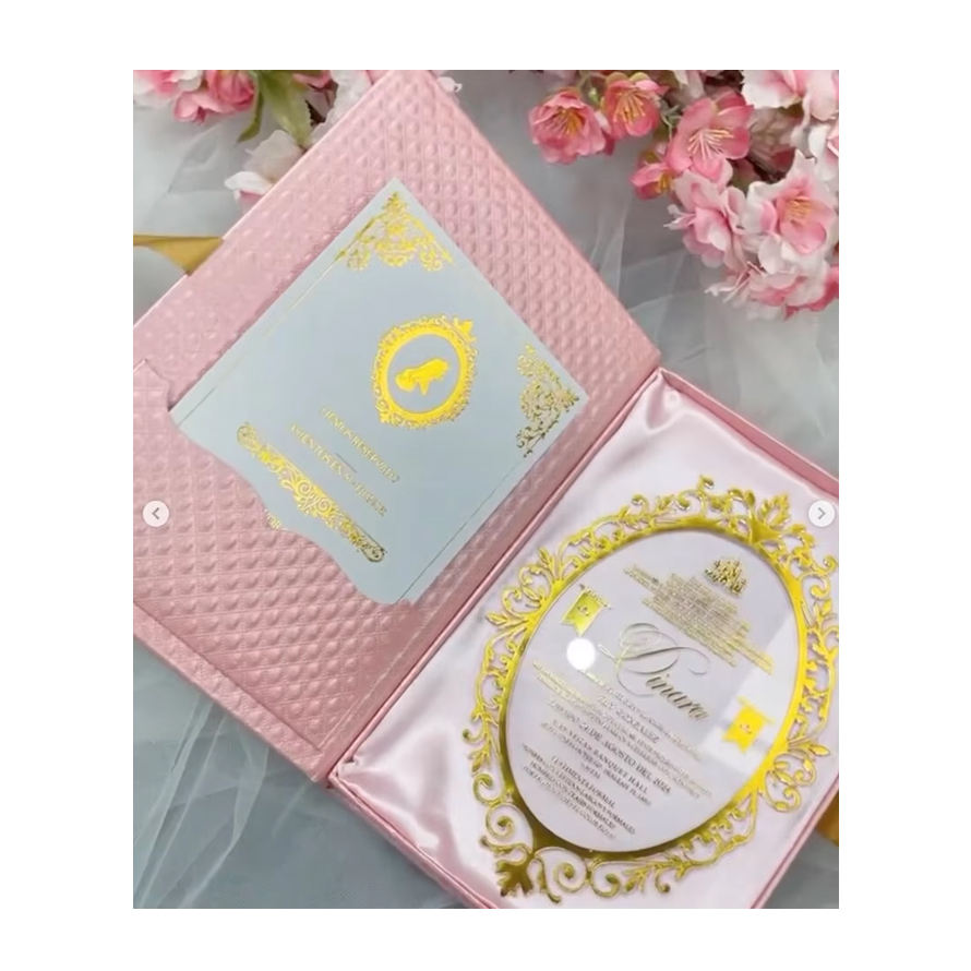 Invitations de mariage personnalisées en acrylique transparent doré découpé au laser, design gratuit, princesse, Quinceanera, Quince, rose, en boîte
