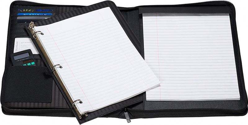 Échantillon gratuit Padfolio à fermeture éclair avec classeur amovible à 3 anneaux et bloc-notes taille lettre, classeur à fermeture éclair noir