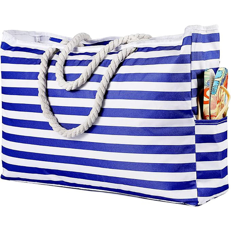 Échantillon gratuit Grands sacs fourre-tout en coton rayés Sac de plage Sac de sport Sac de voyage Sacs à main pour femmes Sac fourre-tout décontracté en toile avec fermeture éclair et fermoir