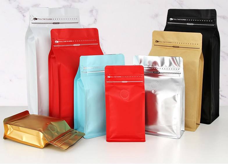 Échantillon gratuit refermable fond carré sac de café 1kg 500g 250g mat plat noir en plastique feuille d'aluminium Pack Valve fermeture éclair thermoscellage