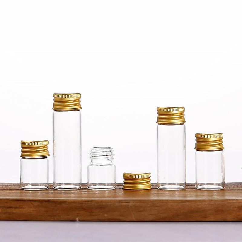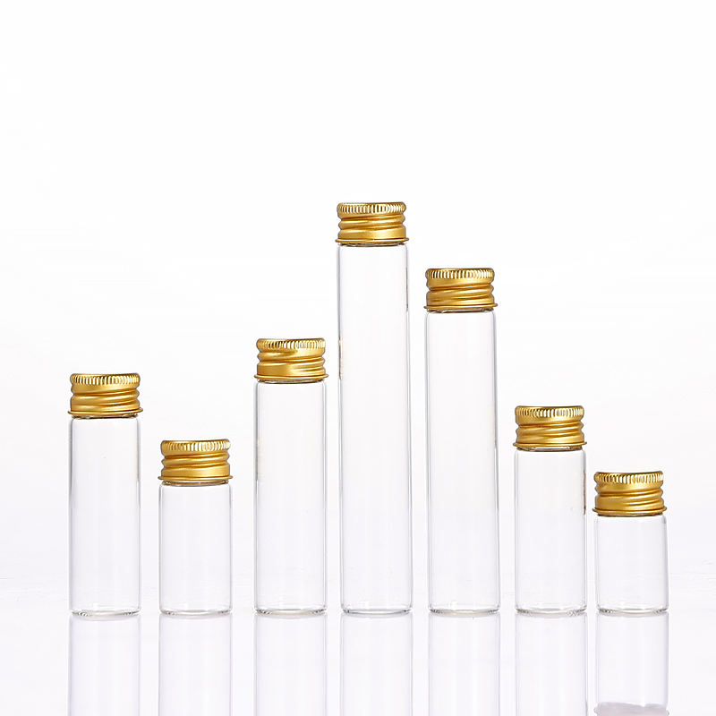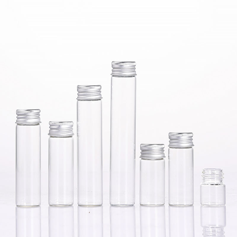 Échantillon gratuit Vente en gros Tube à essai en verre borosilicaté transparent Flacon à bouchon à vis en aluminium Bouteilles en verre