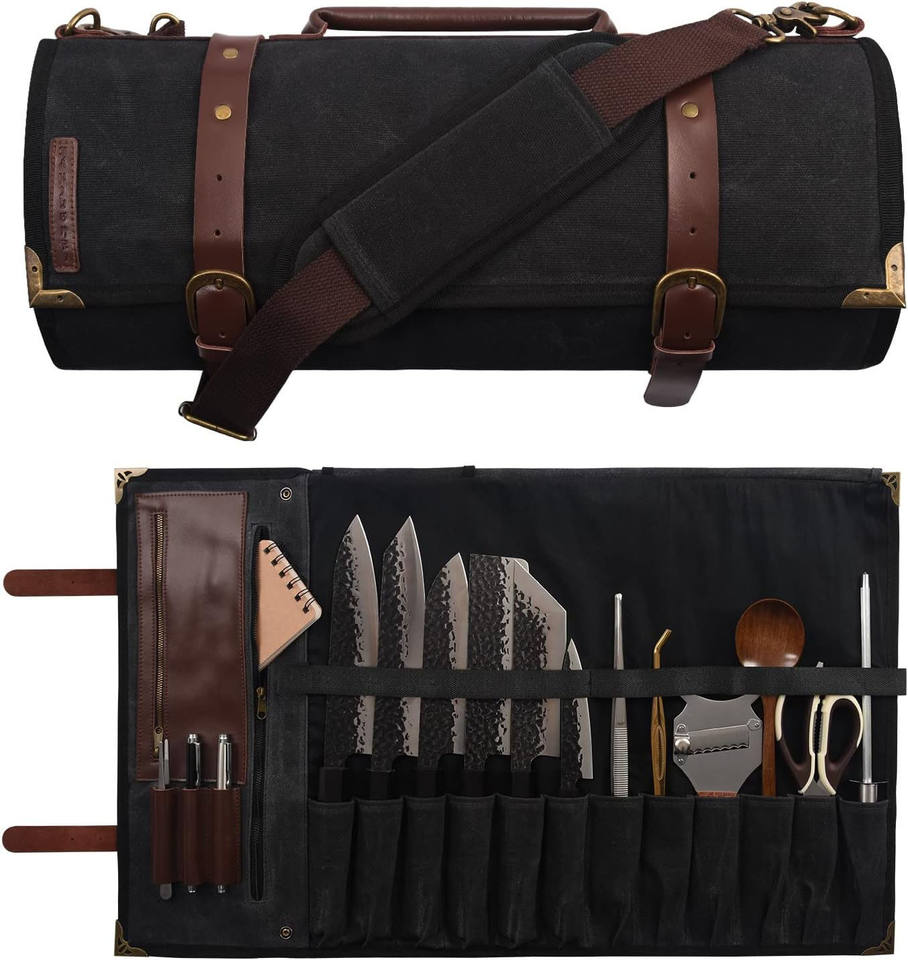 Échantillon gratuit Ensemble de sac à dos pour couteau de chef avec sac à roulettes 30+ poches pour couteaux Ustensiles de cuisine Outils Grandes poches